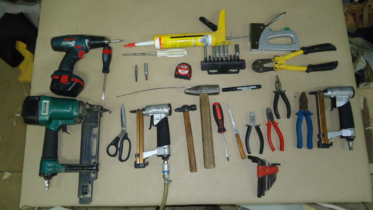 cuchillo de construcción, pegamento, sellador, tornillos;