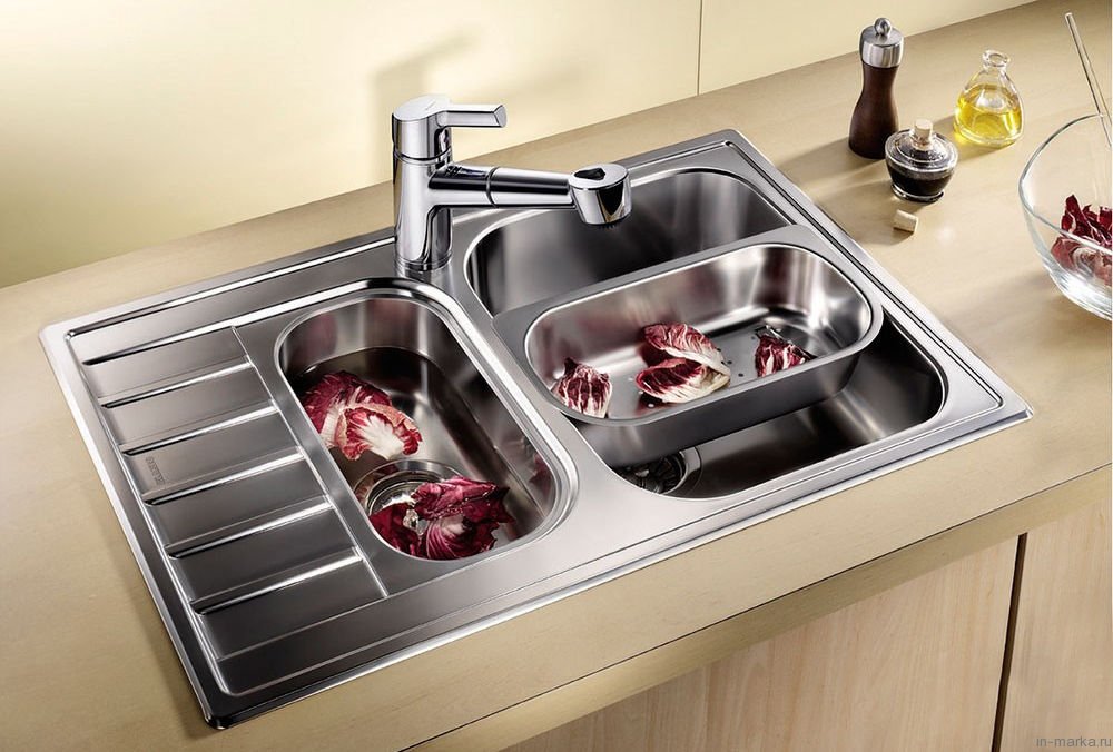 Es conveniente instalar el fregadero en el centro de la encimera, dividiéndolo en zonas funcionales. Por ejemplo, por un lado, puede poner platos sucios y, por otro lado, cortar productos limpios.