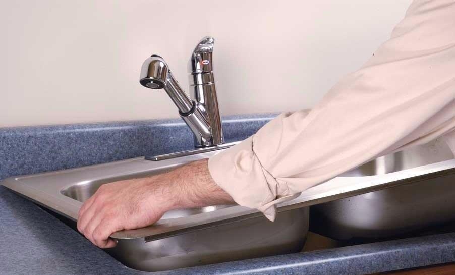 El siguiente paso es instalar el fregadero en el agujero cortado. Se superpone en el lateral del soporte de la grúa. Presiona gradualmente hasta que los objetos estén en contacto total. El exceso de sellador sobresaliente se elimina con un trapo.