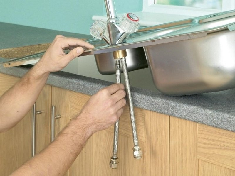 Una vez completada la instalación, se conectan las comunicaciones necesarias. Por lo general, el fregadero se monta con un mezclador fijo, y lo único que queda por hacer es atornillar las mangueras de suministro de agua (caliente, fría) a las tuberías de agua.