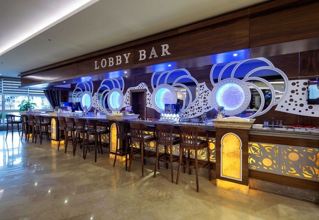 Lobby bar. La instalación está ubicada en el lobby de los hoteles. Diseñado para visitantes y turistas. La cocina suele ser multinacional.