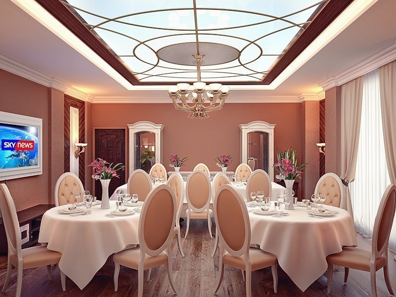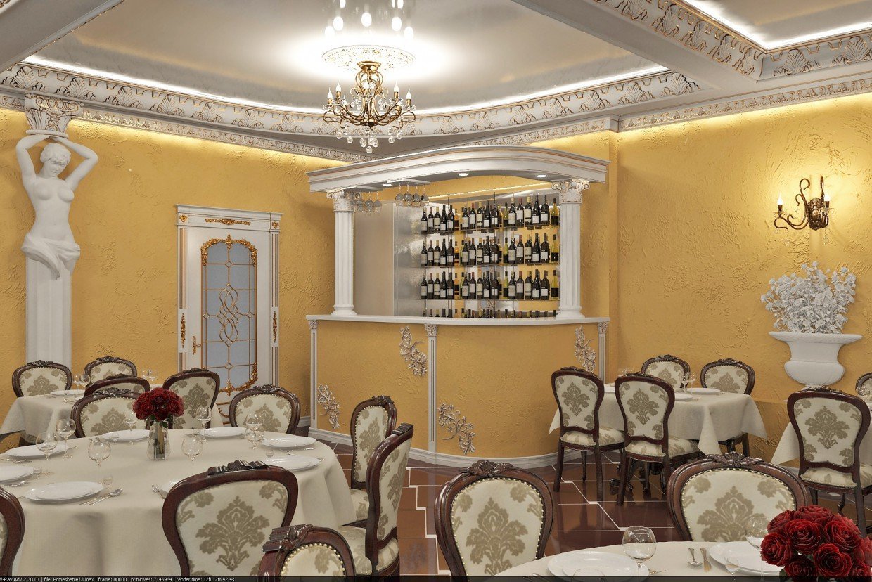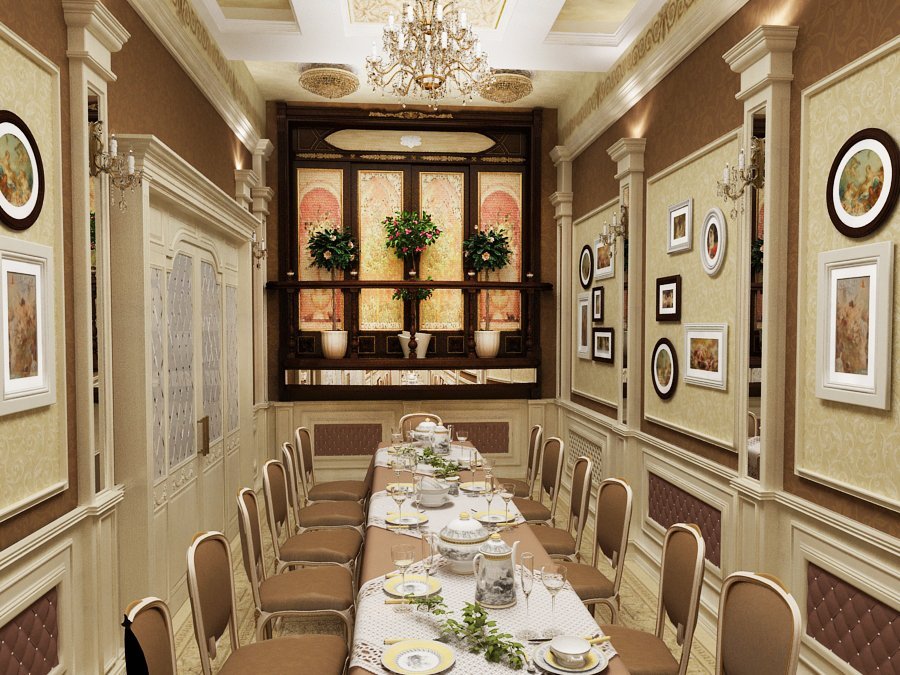 En la decoración clásica prevalecerá el árbol. Se utiliza tanto para decoración como para mobiliario. Sin embargo, no se trata de superficies de madera rústica, sino de elementos finamente elaborados. Los textiles usan telas naturales, "pesadas" con adornos delicadamente elegantes. El estilo clásico no es adecuado para habitaciones pequeñas (menos de 15-20 m2). El problema es que en espacios confinados es difícil darse cuenta para que la dirección no pierda parte del encanto y el lujo. La decoración clásica es muy sobria, el estilo no acepta la abundancia de pequeños detalles que amenazan con convertir el interior en mal gusto. El techo y las paredes están decorados con estuco, la entrada se puede complementar con un arco arqueado sostenido por columnas. La puerta principal está pintada en color blanco noble y decorada con una manija y tallado en oro. Marrón, chocolate, oliva, dorado prevalecen en la paleta de colores. Además, el cristal se usa en la decoración: vasos, figuras, candelabros. El estilo clásico es más adecuado para el interior del restaurante.
