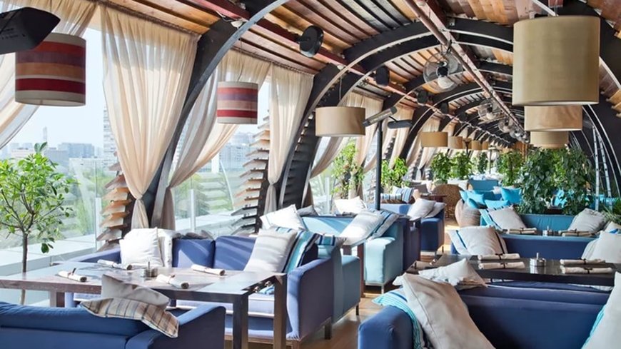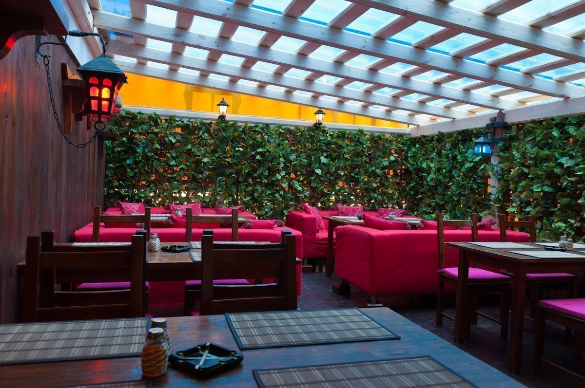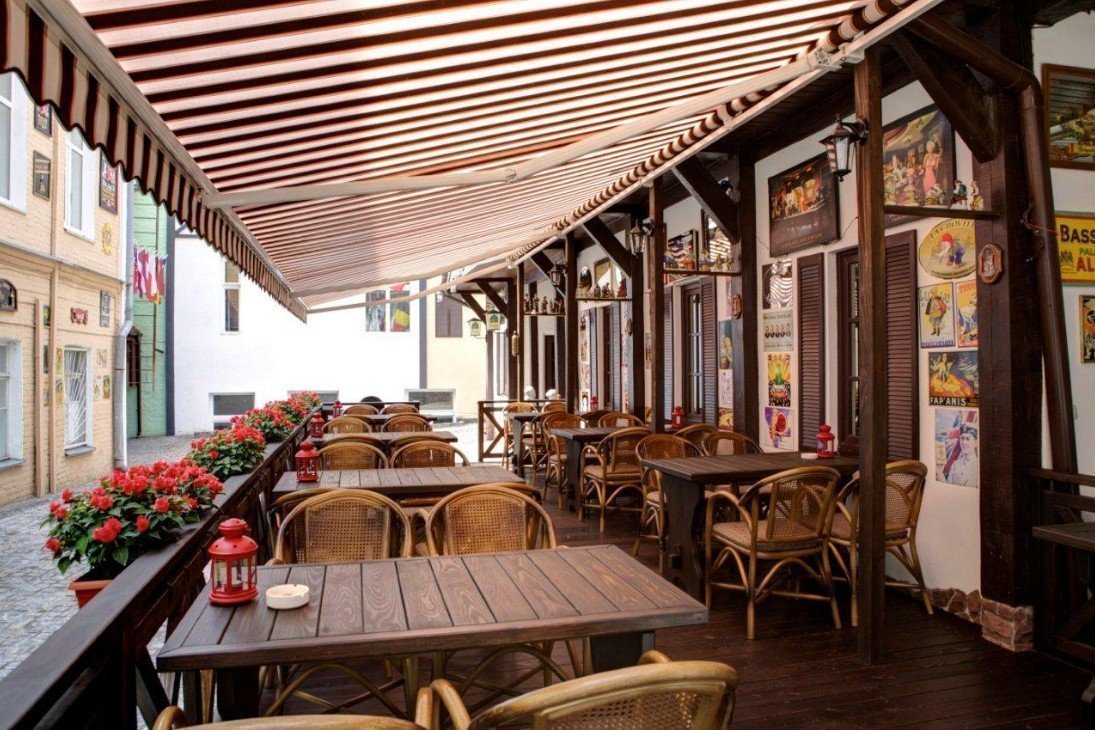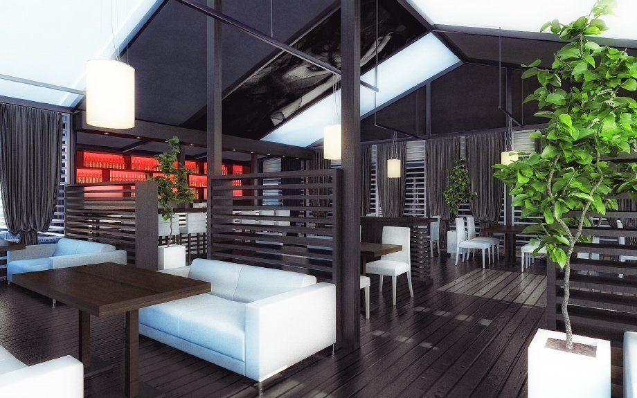 Como regla general, la zona de verano se traslada al patio trasero de la institución o directamente en frente de la fachada y el escaparate. La terraza está equipada con muebles ligeros. Asegúrese de tener una tienda de campaña en el techo, que protegerá contra las lluvias accidentales. El café de verano está decorado con plantas de interior en macetas, árboles enanos y cortinas en improvisadas "ventanas" que ayudan a protegerse del viento y del sol abrasador.