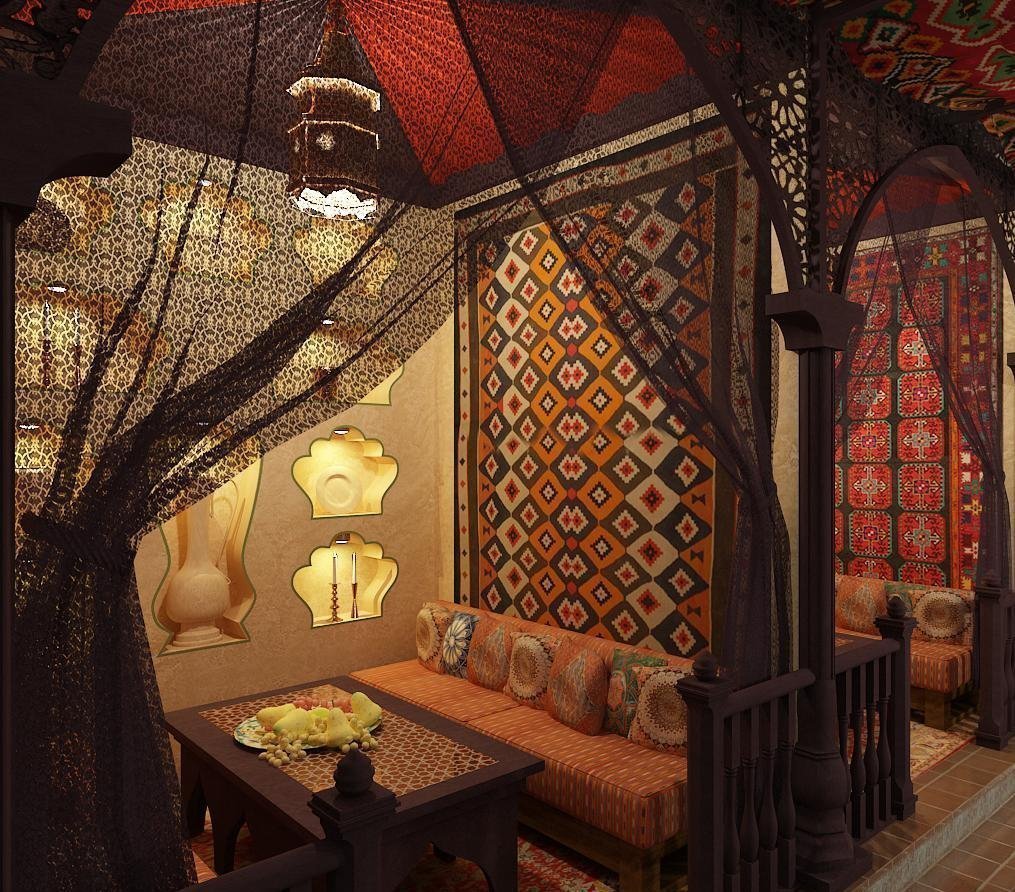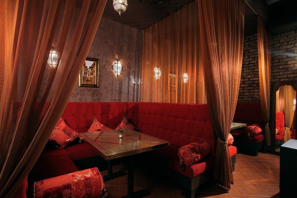 Los cafés de estilo oriental se ven poco convencionales y fascinantes. En el diseño de interiores, la iluminación suave y difusa se desarrolla necesariamente para proporcionar una luz cálida. El suelo está revestido de motivos ornamentales. El adorno sofisticado es una de las principales características del estilo que se usa en casi todas las superficies. Las baldosas están parcialmente cubiertas con alfombras suaves. Los asientos son bajos, siempre decorados con numerosas almohadas. En los cafés orientales, por regla general, se ofrece a los huéspedes fumar una pipa de agua. Es más conveniente hacer esto en habitaciones separadas, que están separadas de la sala común por cortinas translúcidas. Las puertas están decoradas con arcos con arcos característicos que tienen una punta afilada y alargada exactamente en el medio. La sala está decorada con una gran cantidad de lámparas redondas que cuelgan del techo en diferentes niveles. En el esquema de color, se da preferencia a los tonos de rojo, marrón, azul.