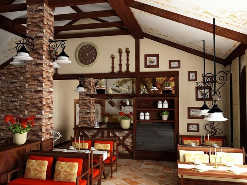 El estilo italiano ha conservado muchas características del barroco, que en un momento se hizo muy popular en este país.Marrón, oliva, terracota, crema, naranja, amarillo, ladrillo prevalecen en la paleta de tonos. La decoración utiliza una combinación de estuco en relieve, piedra en bruto y madera maciza. Además, las variedades de este último se eligen nobles para enfatizar el lujo ligero del interior. El diseño interior utiliza muebles masivos y bajos, decorados con tapicería con motivos florales. Como alternativa, puede elegir sillas de mimbre ligero en lugar de sillas. En las paredes cuelgan collages de fotografías. Un elemento importante de la decoración puede ser vigas de techo y accesorios sin procesar, que también servirán como límites condicionales de las zonas combinadas. Los textiles elegidos están ricamente decorados con patrones. Las mesas generalmente están cubiertas con manteles a cuadros. La decoración utiliza plantas de interior, elementos de mimbre, botellas de vino que se llevan fuera del bar.