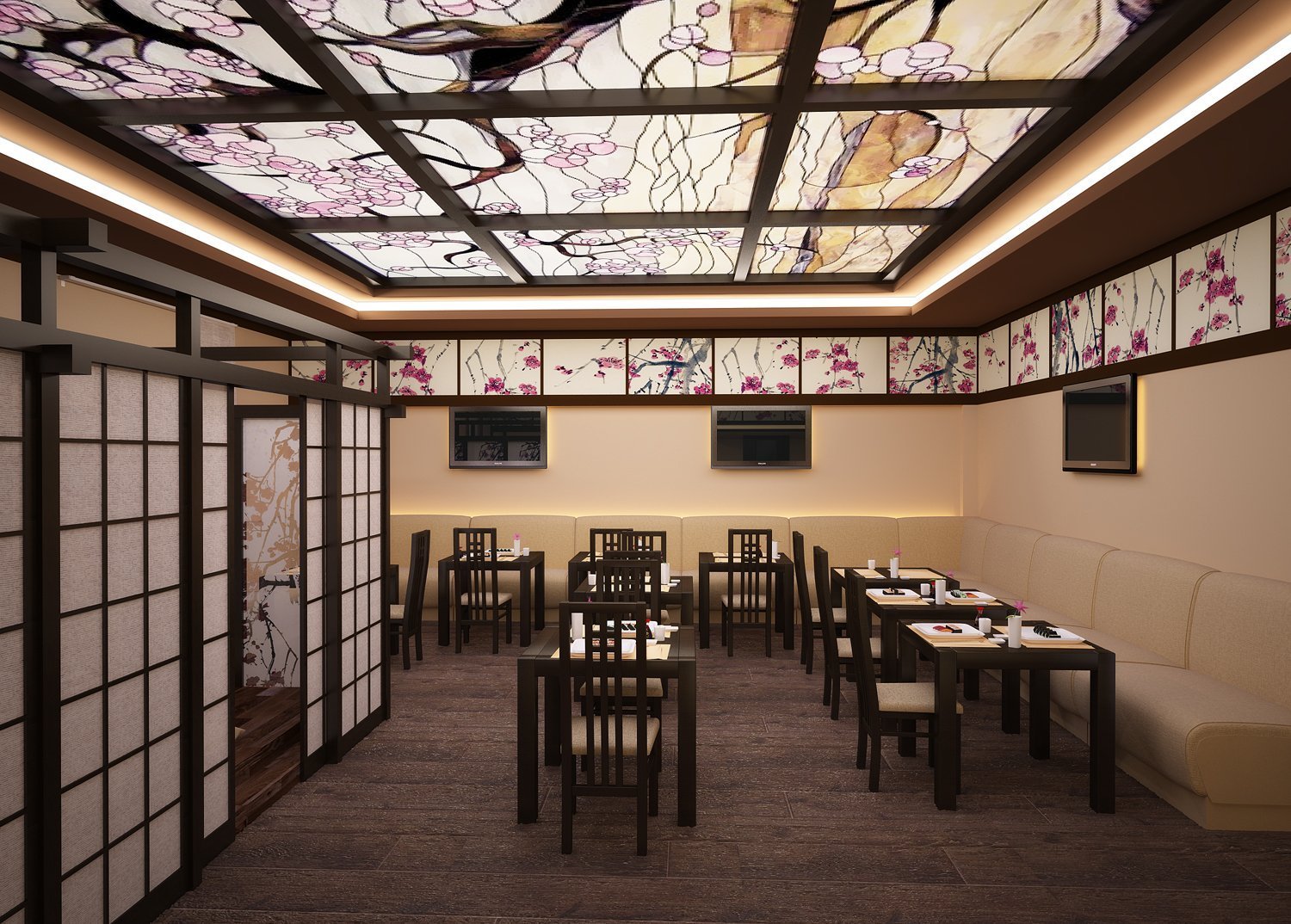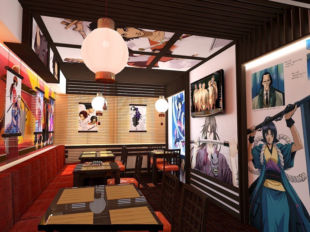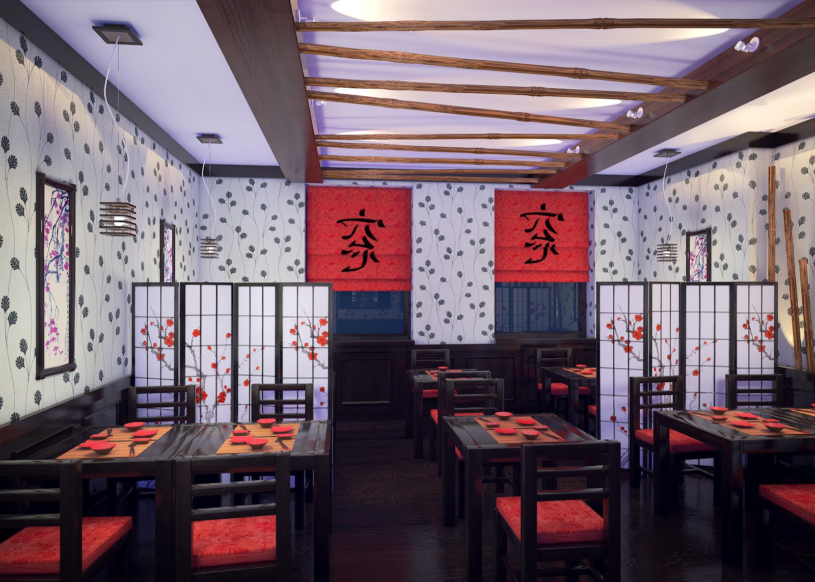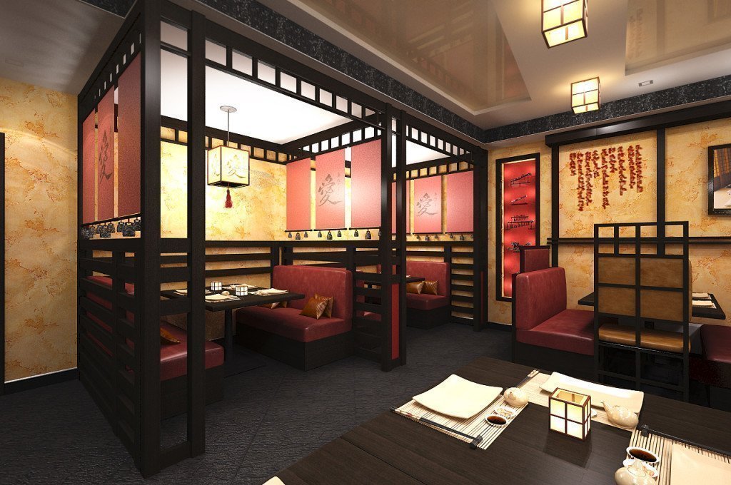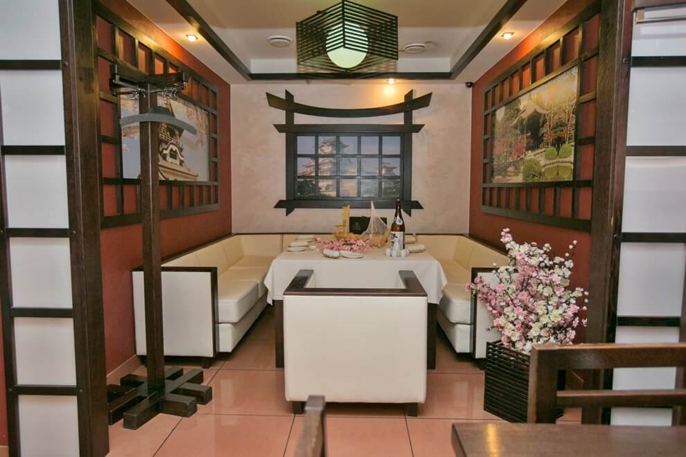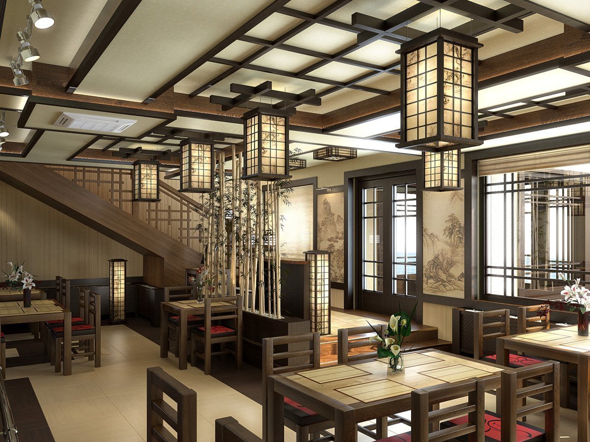 El estilo japonés es una parte integral de lo oriental. Conservó sus características básicas, pero él mismo no carece de personalidad. La decoración interior es relevante de acuerdo con los cánones de esta tendencia para bares de sushi y cafeterías con la misma cocina. La decoración utiliza madera en tonos claros. Las paredes y el techo están decorados con paneles que se utilizan en todas partes del país del sol naciente. Los asientos están decorados con mesas bajas y colchonetas o sillas sin patas. El lugar está decorado con lujosas imitaciones de jarrones de la era Ming, paneles que representan flores de sakura, linternas voluminosas, un camino hecho de piedras planas directamente en el piso. El interior está decorado en colores neutros: blanco, negro, marrón, gris. Las ventanas tienen cortinas de paneles de seda, algodón y lino. Asegúrese de tener plantas vivas en la habitación.