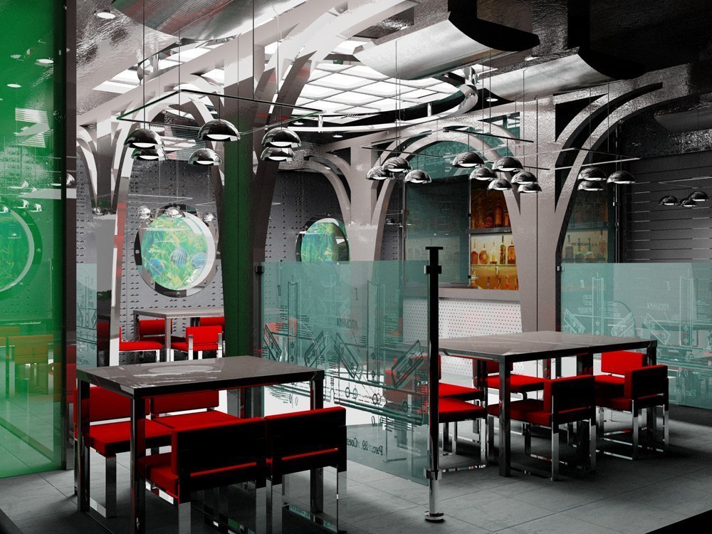 Los interiores en estilo de alta tecnología son de estilo moderno, sin embargo, será difícil de encontrar en aquellos que son de la tradición con ambas manos. Por esta razón, la dirección de alta tecnología dará comodidad principalmente a la generación más joven. Este matiz debe tenerse en cuenta al desarrollar el concepto de institución. En la decoración de paredes y techos, se utilizan superficies de plástico, cromo y vidrio, ladrillo en bruto y piedra. La iluminación utiliza múltiples niveles, neón-frío. Es mejor colocar el piso a granel con un brillo brillante. El mobiliario se utiliza de forma simple, con estricta geometría de líneas. En tonos, los principales son gris, blanco y negro. Trinity se puede complementar con lila, azul, rojo, azul, amarillo, es decir, cualquier color que se resalte con la luz de fondo correspondiente. Las ventanas usan panorámicas. Cortina con persianas elegantes. Los objetos de arte al estilo del cubismo, el constructivismo y el futurismo pueden servir como decoración. Diluye el ambiente frío y tecnológico con plantas de interior en macetas cuadradas o triangulares.