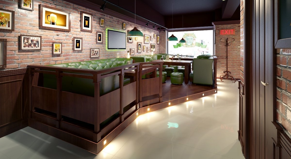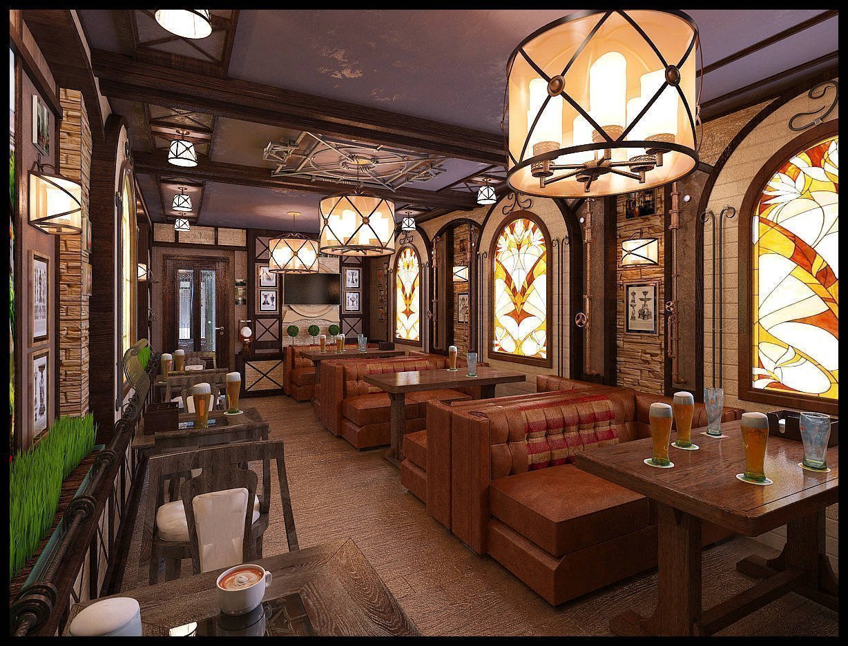 El interior del bar de cerveza debe ser propicio para una comunicación fácil y unas vacaciones relajantes. El ambiente en las instituciones a menudo se mantiene relajado, lo que contribuye a la liberación de los visitantes. A menudo están equipados en el sótano. El café bar puede ampliar su audiencia y transmitir partidos deportivos a diario. En el interior de la institución, se recomienda utilizar madera y ladrillo. Los tonos se eligen de la gama "natural", es decir, de tonos marrones. La atmósfera natural favorecerá el uso de alcohol ligero, lo que aumentará los ingresos.