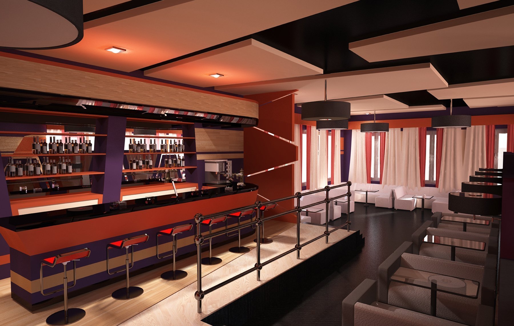 La presencia de un bar no es solo un atributo de las instituciones con el mismo nombre. Se instala en todas partes, ya que entre los huéspedes de cualquier categoría hay quienes quieren pasar el tiempo con un vaso de bebida fuerte. En los bares, los estantes ocupan la mayor parte del área de la sala común. En las instituciones que se centran en la cocina deliciosa, el rincón del "alcohol" se encuentra en una pequeña plataforma. Los mostradores de barra están diseñados de acuerdo con la decisión estilística general, sin embargo, con mayor frecuencia se convierten en áreas de acento, lo más destacado del interior, contra lo que se destacan. Sin lugar a dudas están equipadas con sillas altas para los huéspedes. La espectacular iluminación enfatiza la peculiaridad del objeto interior.