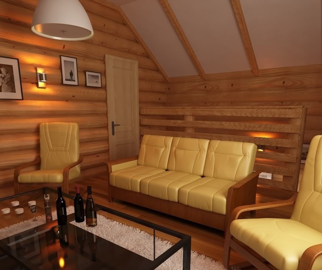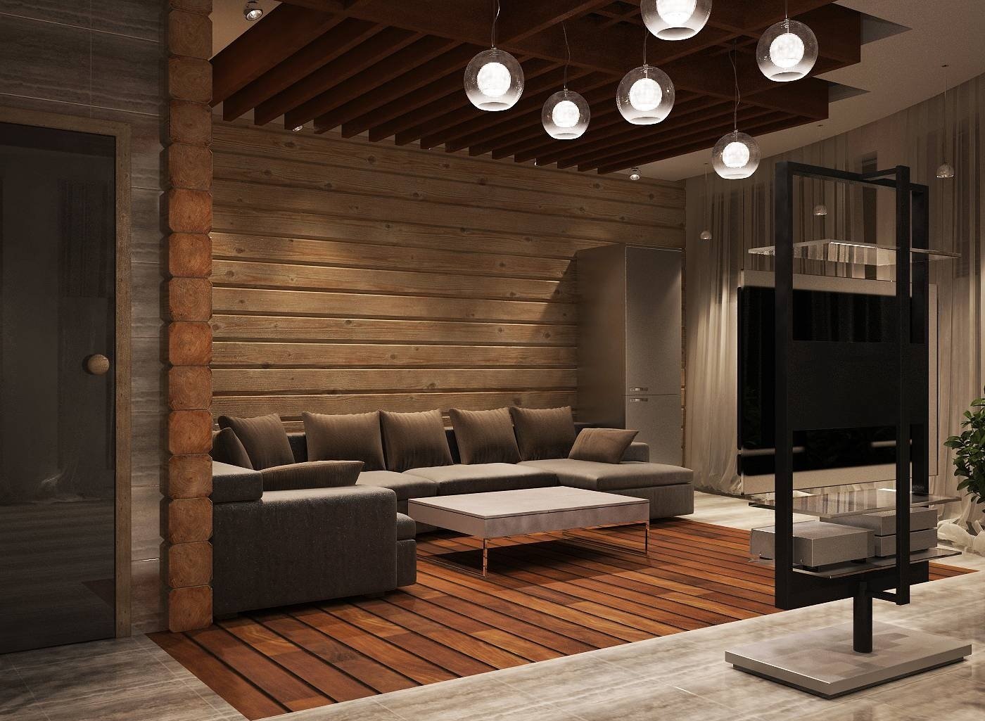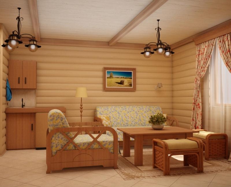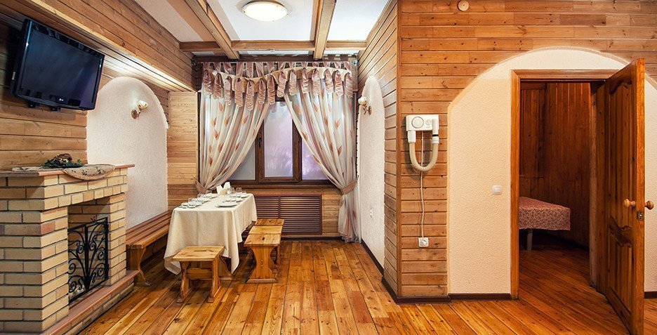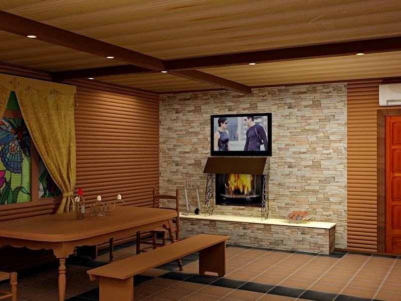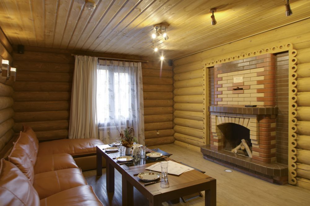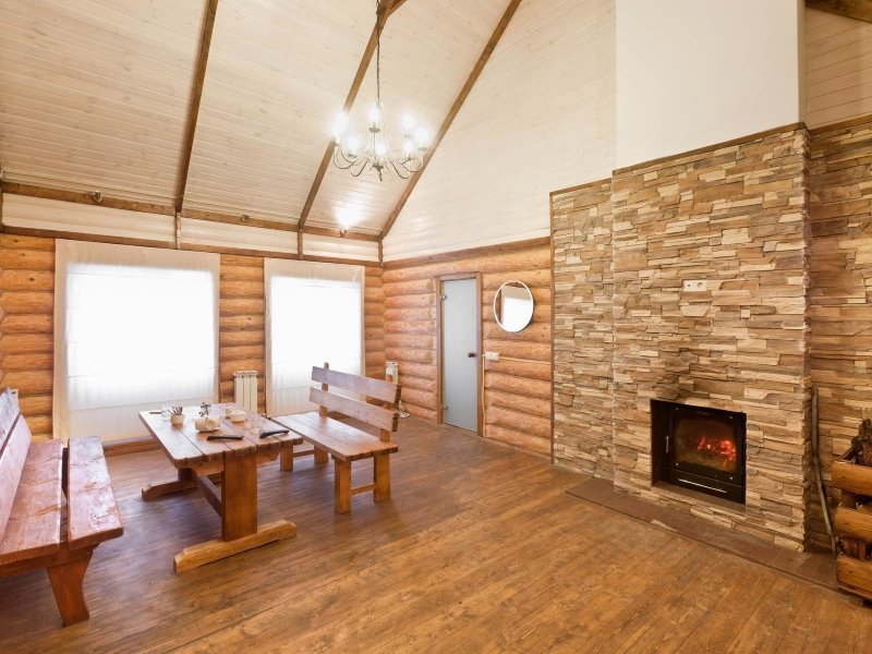Si la casa de baños está diseñada para recibir grandes empresas, uno de los invitados se sentirá incómodo para acostarse y dormir, mientras que el resto celebra o hace ruido. En este caso, una esquina separada con una tumbona o sofá está cercada del resto de la habitación con textiles. Las cortinas, si es necesario, crearán la ilusión de protección. En otros casos, la zonificación se piensa de antemano, e incluso en la etapa de construcción, se erige un tabique. La cocina del comedor está óptimamente separada por una barra de bar o una amplia encimera. Una chimenea con una ubicación central también hará un buen trabajo.