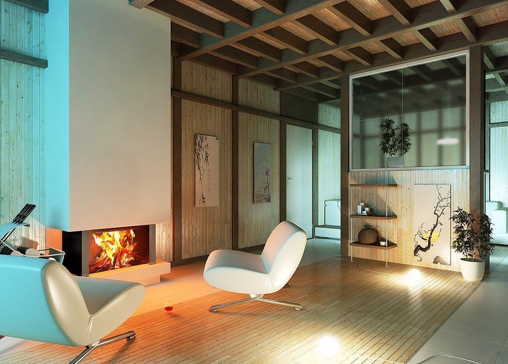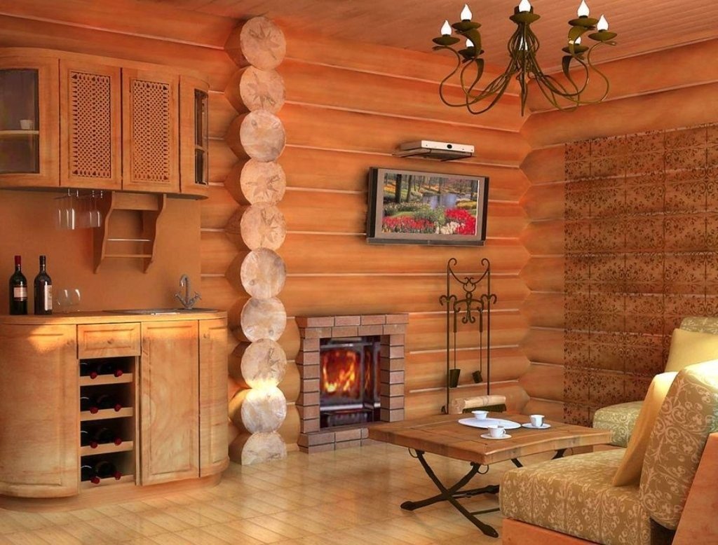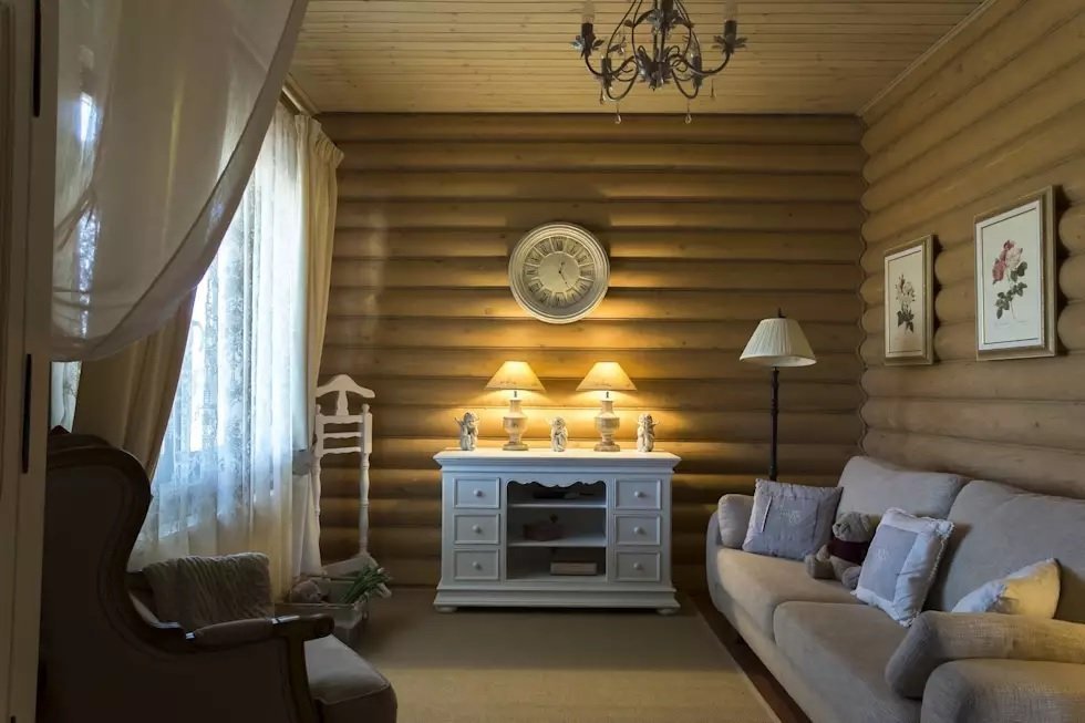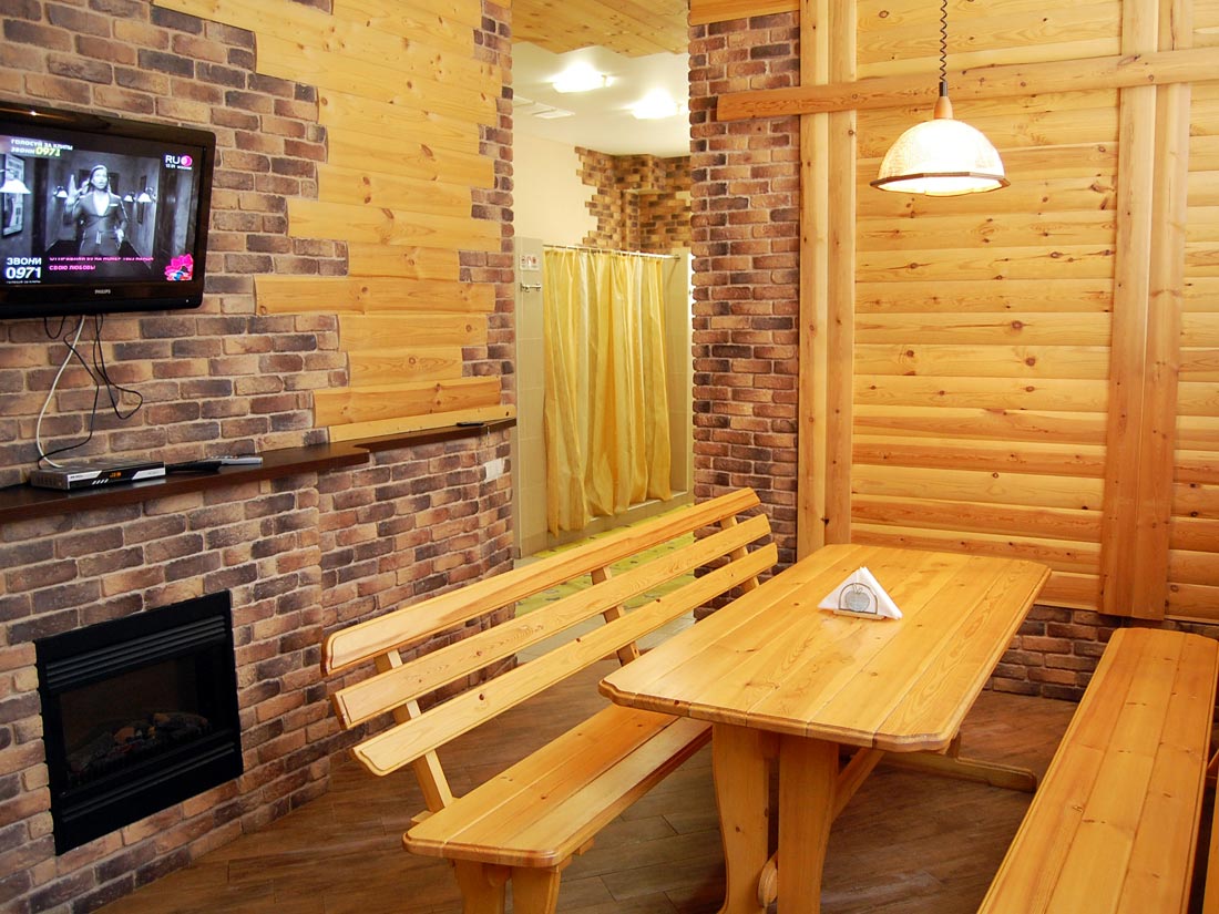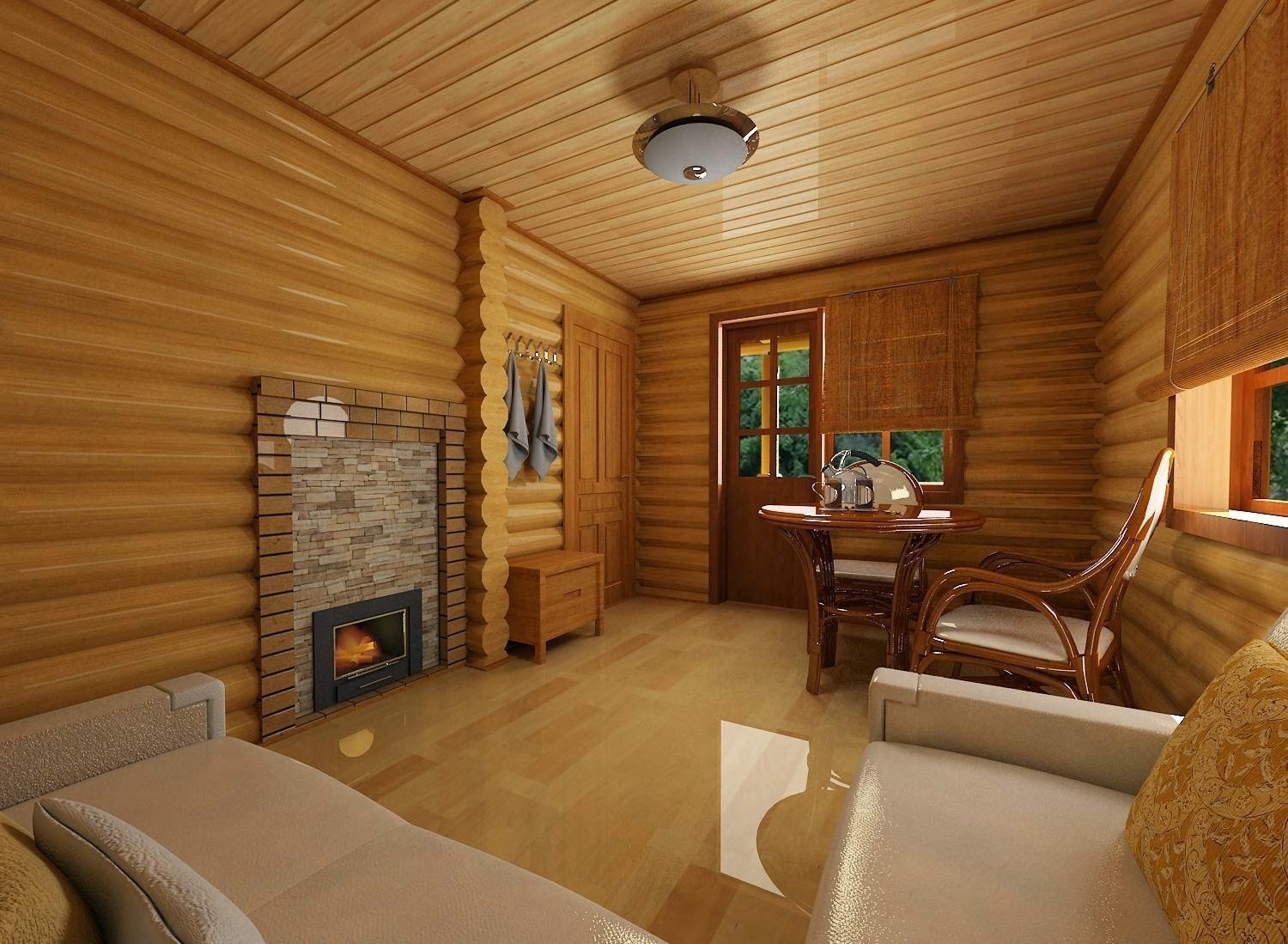 Si la casa de baños está diseñada para recibir grandes empresas, uno de los invitados se sentirá incómodo para acostarse y dormir, mientras que el resto celebra o hace ruido. En este caso, una esquina separada con una tumbona o sofá está cercada del resto de la habitación con textiles. Las cortinas, si es necesario, crearán la ilusión de protección. En otros casos, la zonificación se piensa de antemano, e incluso en la etapa de construcción, se erige un tabique. La cocina del comedor está óptimamente separada por una barra de bar o una amplia encimera. Una chimenea con una ubicación central también hará un buen trabajo.
