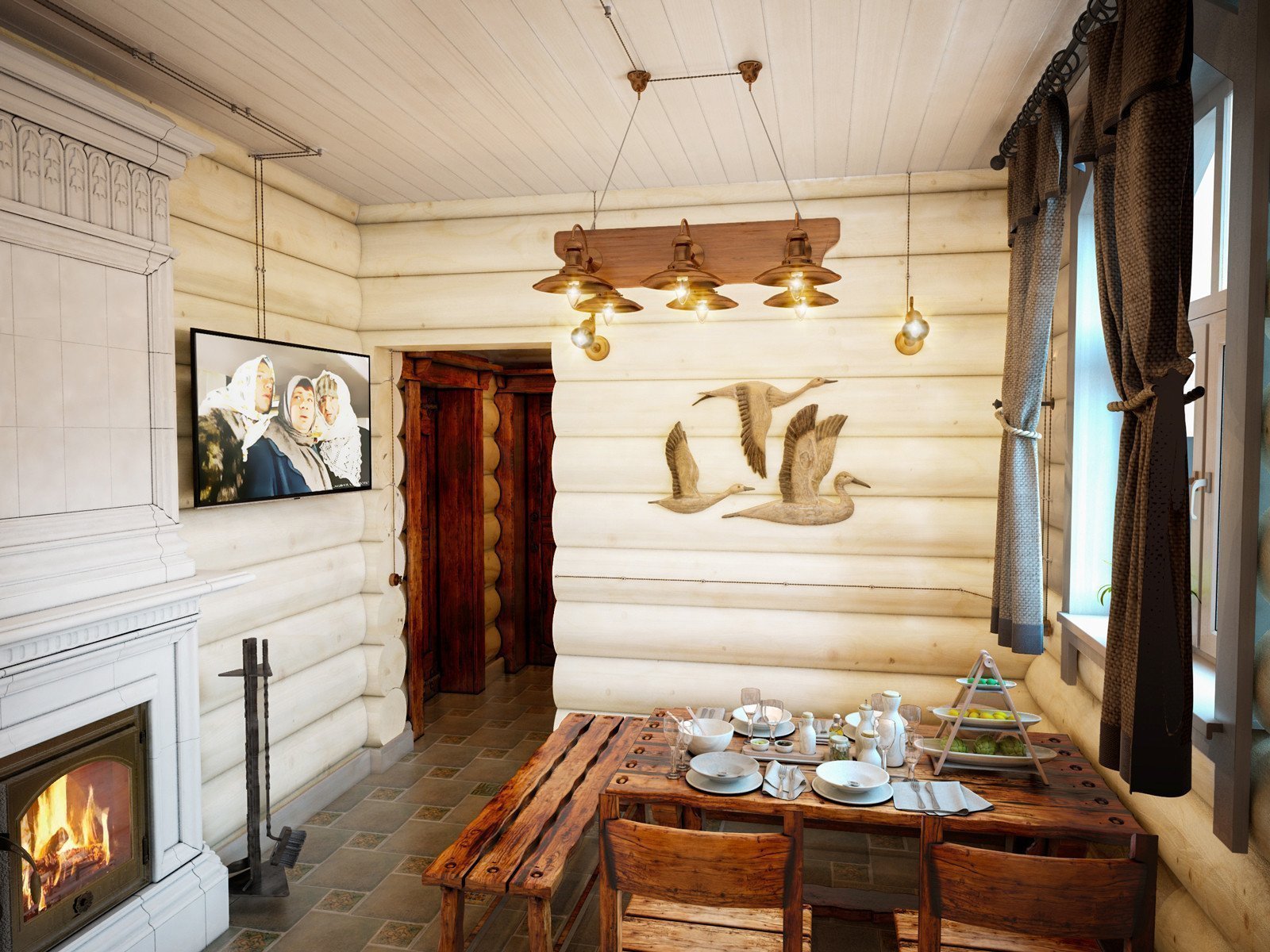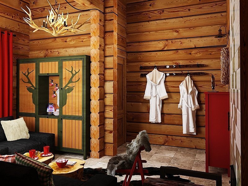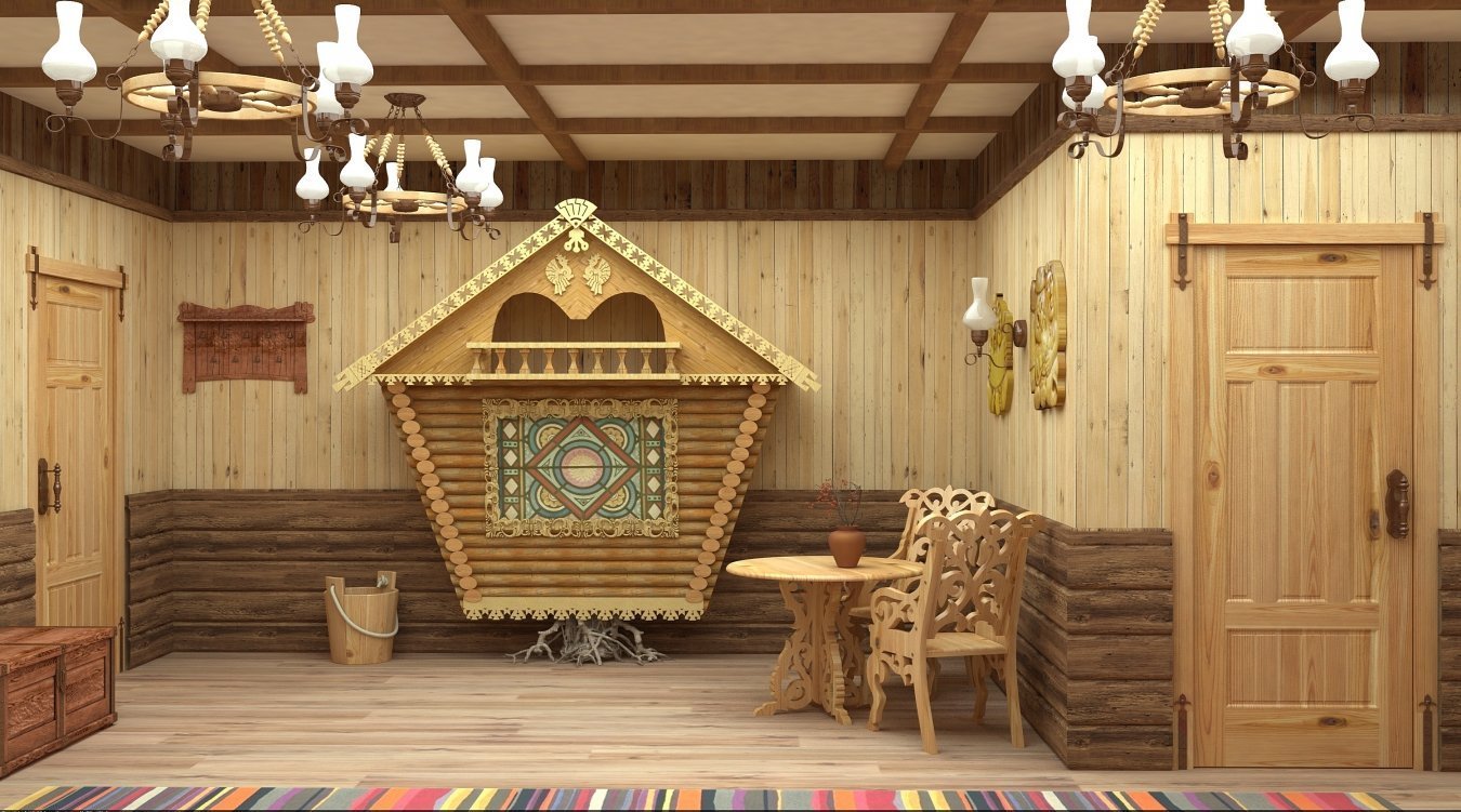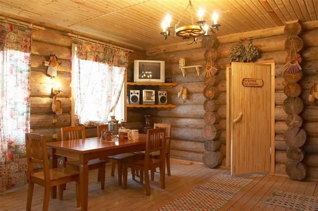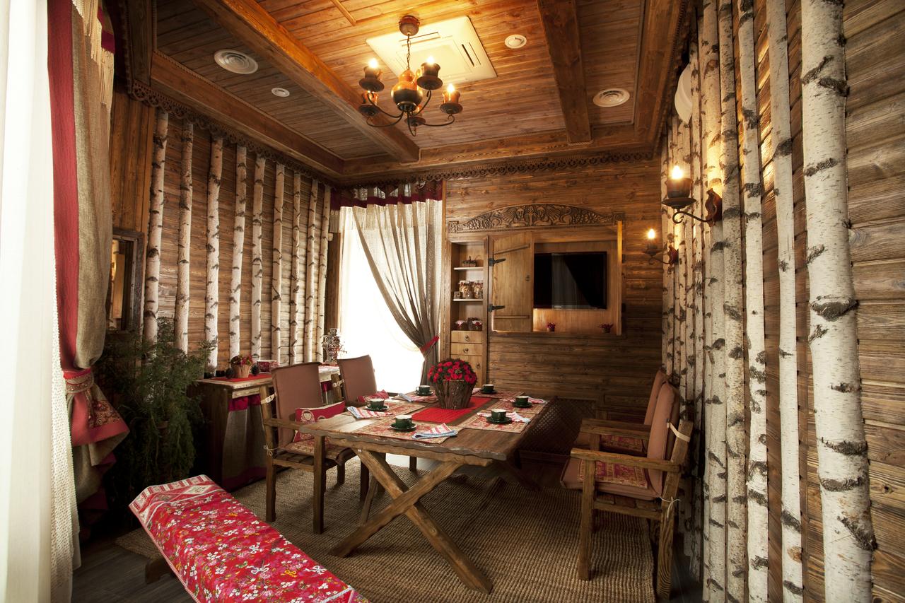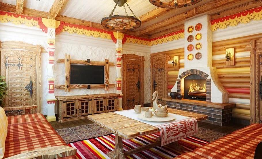 El sabor ruso se encarna en detalle. En la decoración, se deben usar tallas de madera, sin las cuales ninguna cabaña o casa de baños se había completado previamente. El techo se puede decorar originalmente con hileras de escobas suspendidas. Los muebles se eligen de madera natural.Se requiere un samovar sobre la mesa. Los textiles usan telas con motivos florales bordados. Los utensilios de cocina se seleccionan de madera, cerámica o arcilla con pintura tradicional rusa. El piso está cubierto con alfombras de varios tamaños, cosidas con sus propias manos de materiales improvisados (restos de tela, hilos de lana).