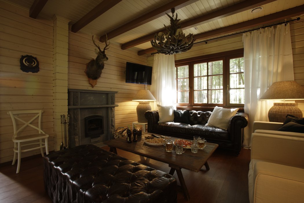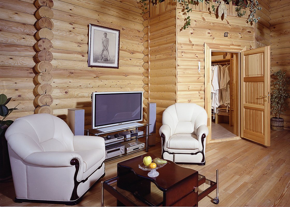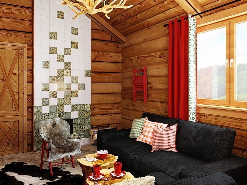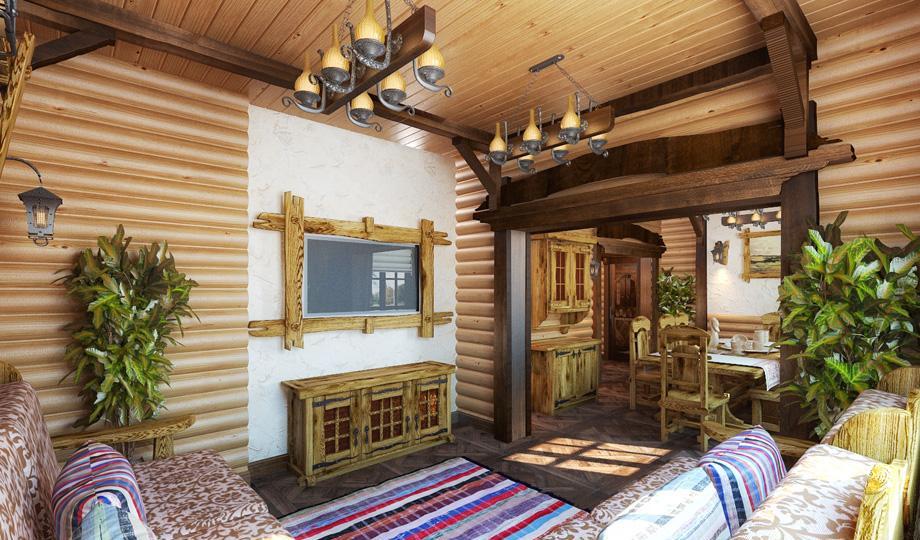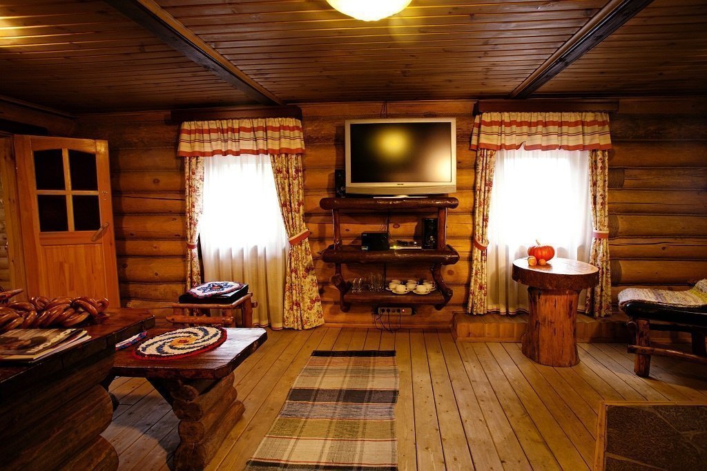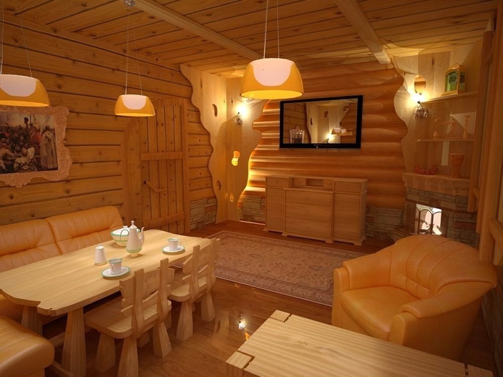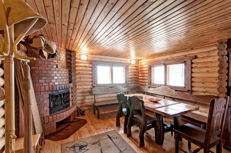 El sabor ruso se encarna en detalle. En la decoración, se deben usar tallas de madera, sin las cuales ninguna cabaña o casa de baños se había completado previamente. El techo se puede decorar originalmente con hileras de escobas suspendidas. Los muebles se eligen de madera natural.Se requiere un samovar sobre la mesa. Los textiles usan telas con motivos florales bordados. Los utensilios de cocina se seleccionan de madera, cerámica o arcilla con pintura tradicional rusa. El piso está cubierto con alfombras de varios tamaños, cosidas con sus propias manos de materiales improvisados (restos de tela, hilos de lana).