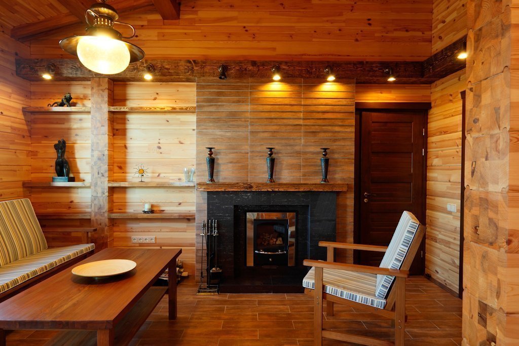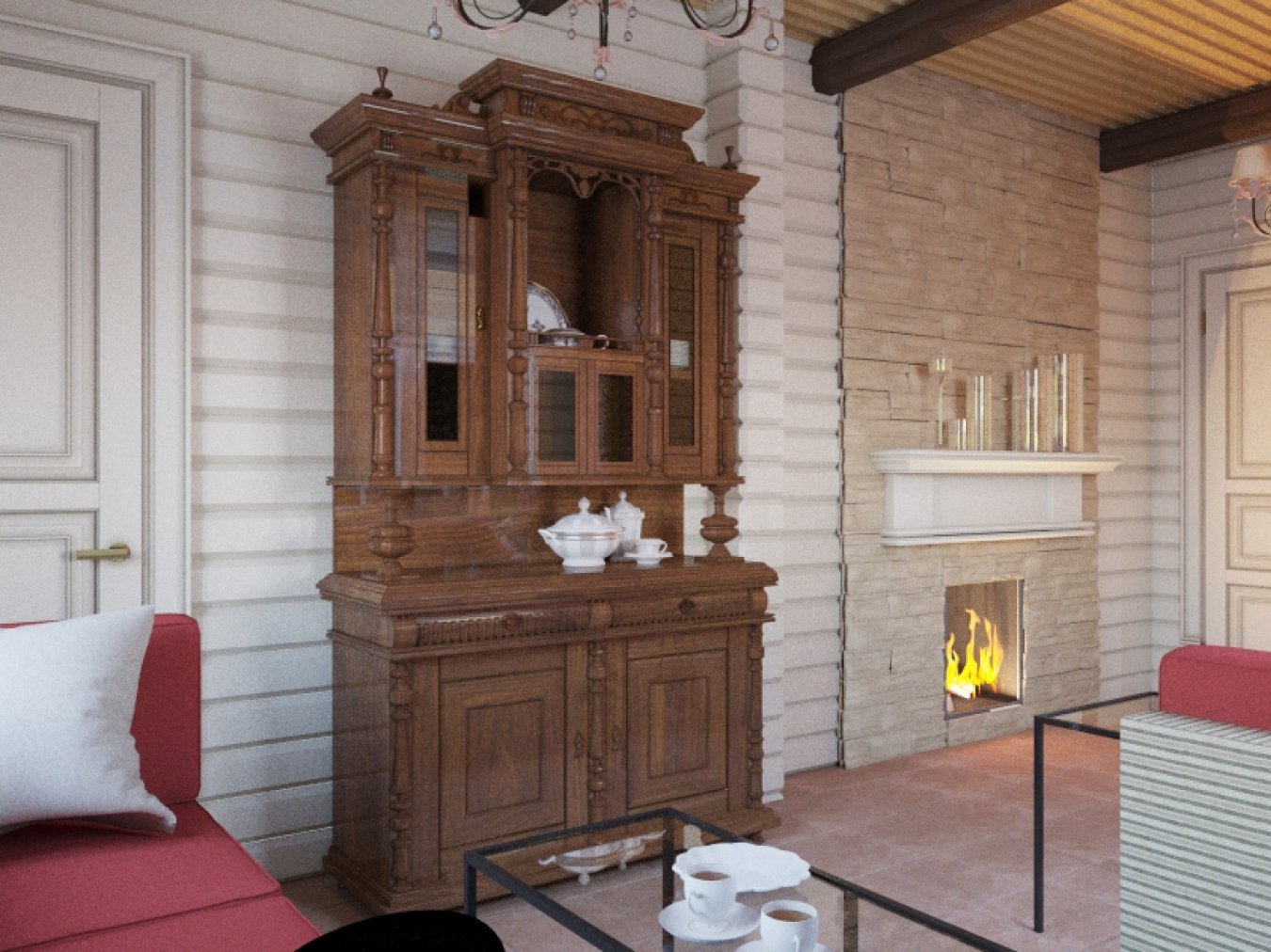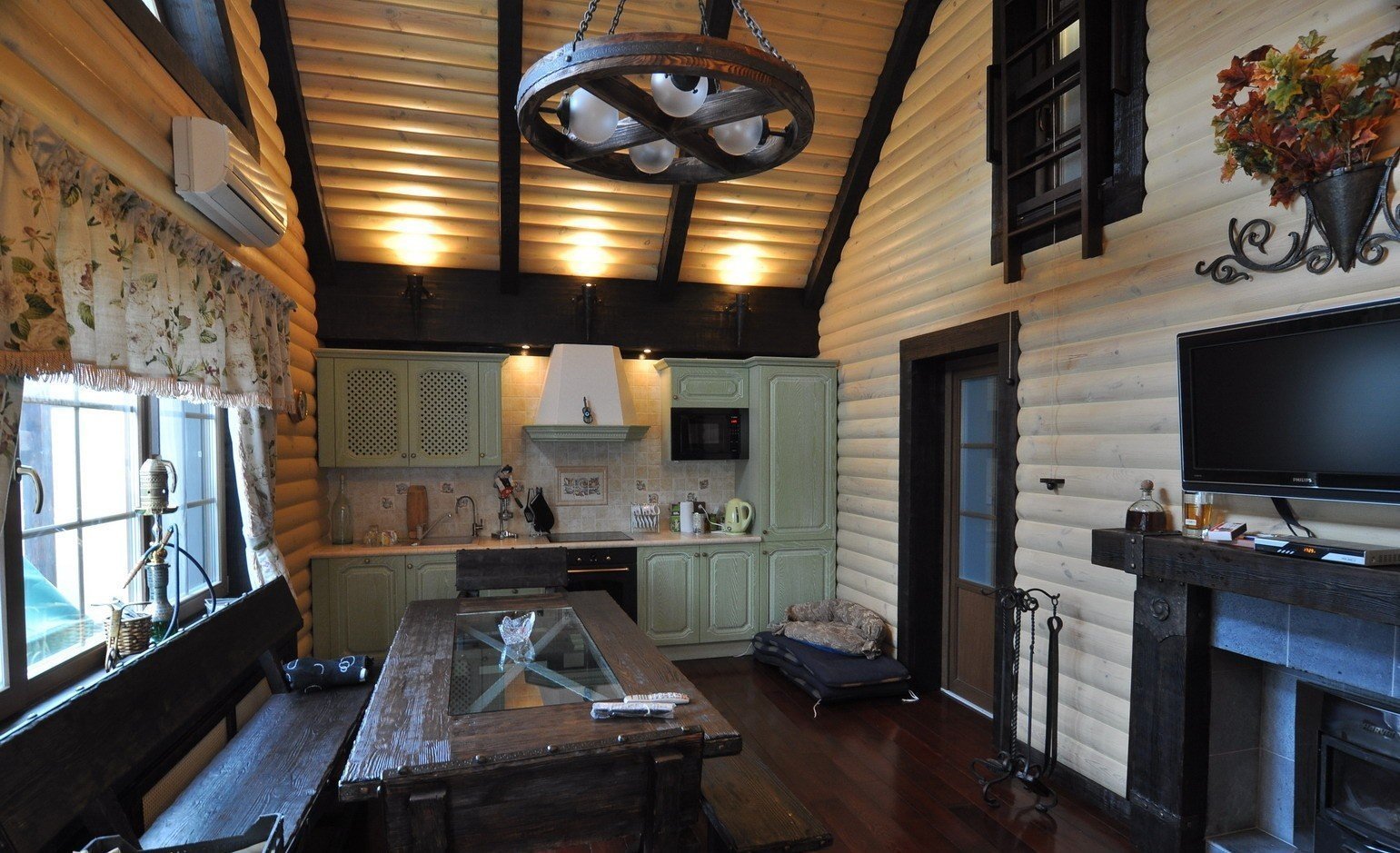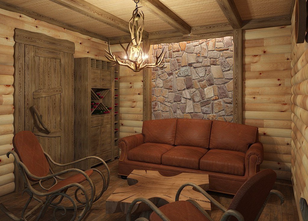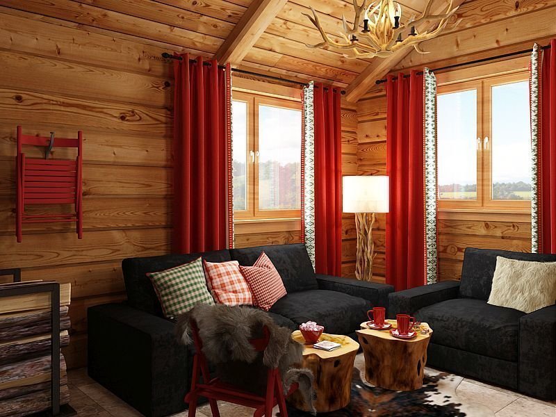 El sabor ruso se encarna en detalle. En la decoración, se deben usar tallas de madera, sin las cuales ninguna cabaña o casa de baños se había completado previamente. El techo se puede decorar originalmente con hileras de escobas suspendidas. Los muebles se eligen de madera natural.Se requiere un samovar sobre la mesa. Los textiles usan telas con motivos florales bordados. Los utensilios de cocina se seleccionan de madera, cerámica o arcilla con pintura tradicional rusa. El piso está cubierto con alfombras de varios tamaños, cosidas con sus propias manos de materiales improvisados (restos de tela, hilos de lana).