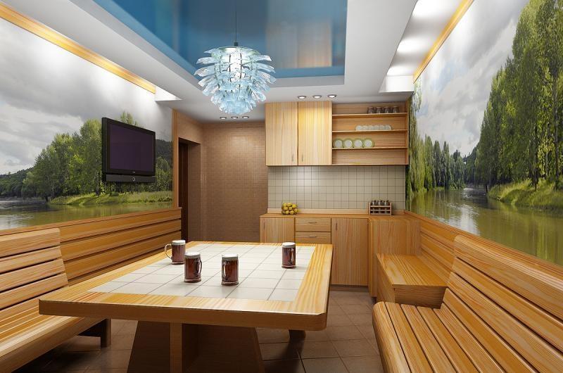 Forro.Adecuado para interiores sin pretensiones. El material se adapta orgánicamente al estilo rural, provenzal y ruso. • Fondo de pantalla. No se usan con mucha frecuencia, ya que solo las opciones confiables y resistentes a la humedad son adecuadas para el baño.