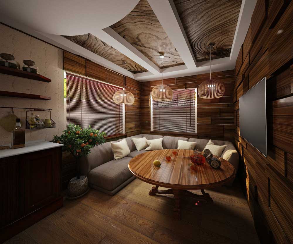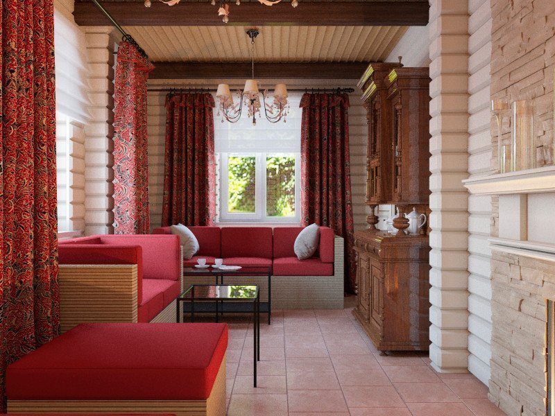 Linóleo, baldosas o tablestacas generalmente se colocan en el piso. Estos últimos están pulidos para que brillen, por lo que su superficie no está llena de problemas en forma de astillas para los talones desnudos de los invitados. En realizaciones más caras, se usa un piso a granel. El salón con un acabado similar corresponde a los cánones de los estilos de élite. El techo está enlucido, pintado o revestido con tablilla.
