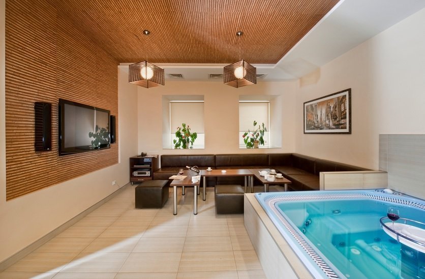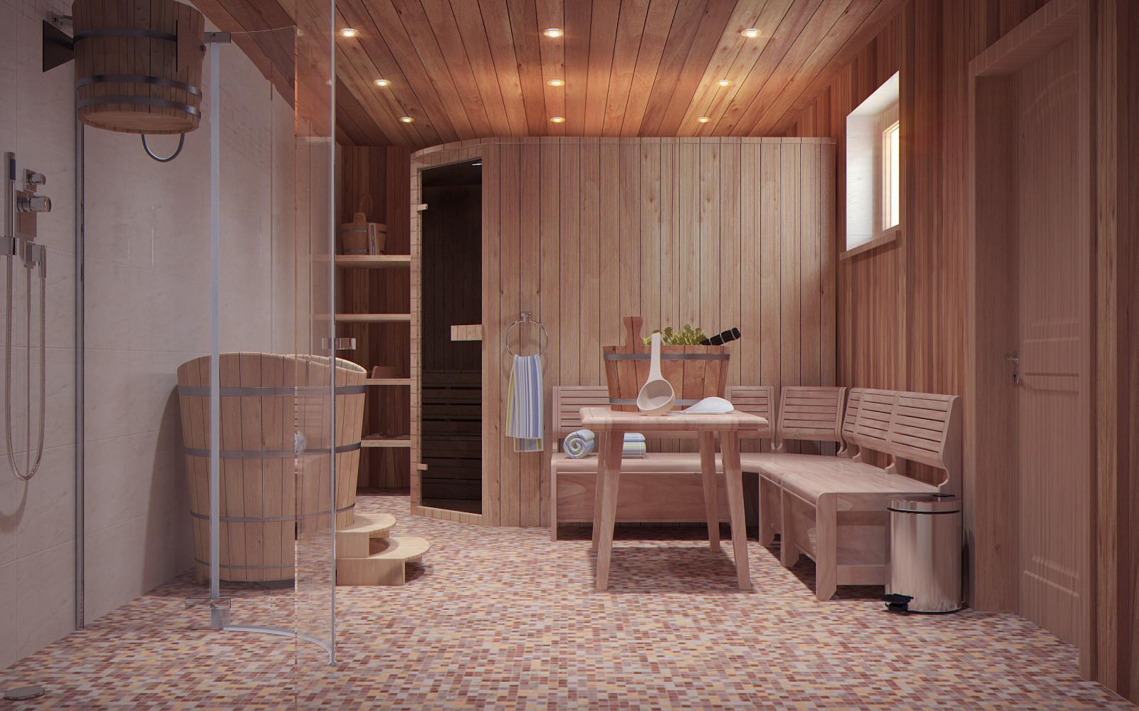 Tradicionalmente prefieren todos los tonos de marrón. Este color es característico de la madera, que es la base para la decoración de una antigua casa de baños rústica y una sauna moderna. Será posible descansar moralmente solo en una habitación decorada con colores suaves. No obligan a los ojos a tensarse una vez más y a relajarse psicológicamente. Subconscientemente fácil de percibir: