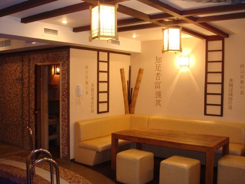El estilo japonés es conciso y simple. En el país del sol naciente y la casa de baños no se parece mucho a las opciones tradicionales. Los japoneses están humeando en un barril de agua caliente. La decoración del salón con azulejos de cerámica. Las ventanas están cerradas con paneles de bambú y las puertas tienen una estructura deslizante. Los muebles se eligen bajo, es mejor usar esteras y sillas tradicionales sin patas. Decoran la habitación con un par de pinturas o abanicos abiertos en las paredes, linternas japonesas tradicionales (andones, tías), floreros y almohadas de piso macizo, que se colocan directamente sobre las alfombras. Es importante saberlo. En el estilo oriental, los aromas ocupan un lugar especial. Se instala un incensario con incienso en una esquina separada, que gradualmente llenará la habitación y tendrá un efecto beneficioso en la compañía relajada.