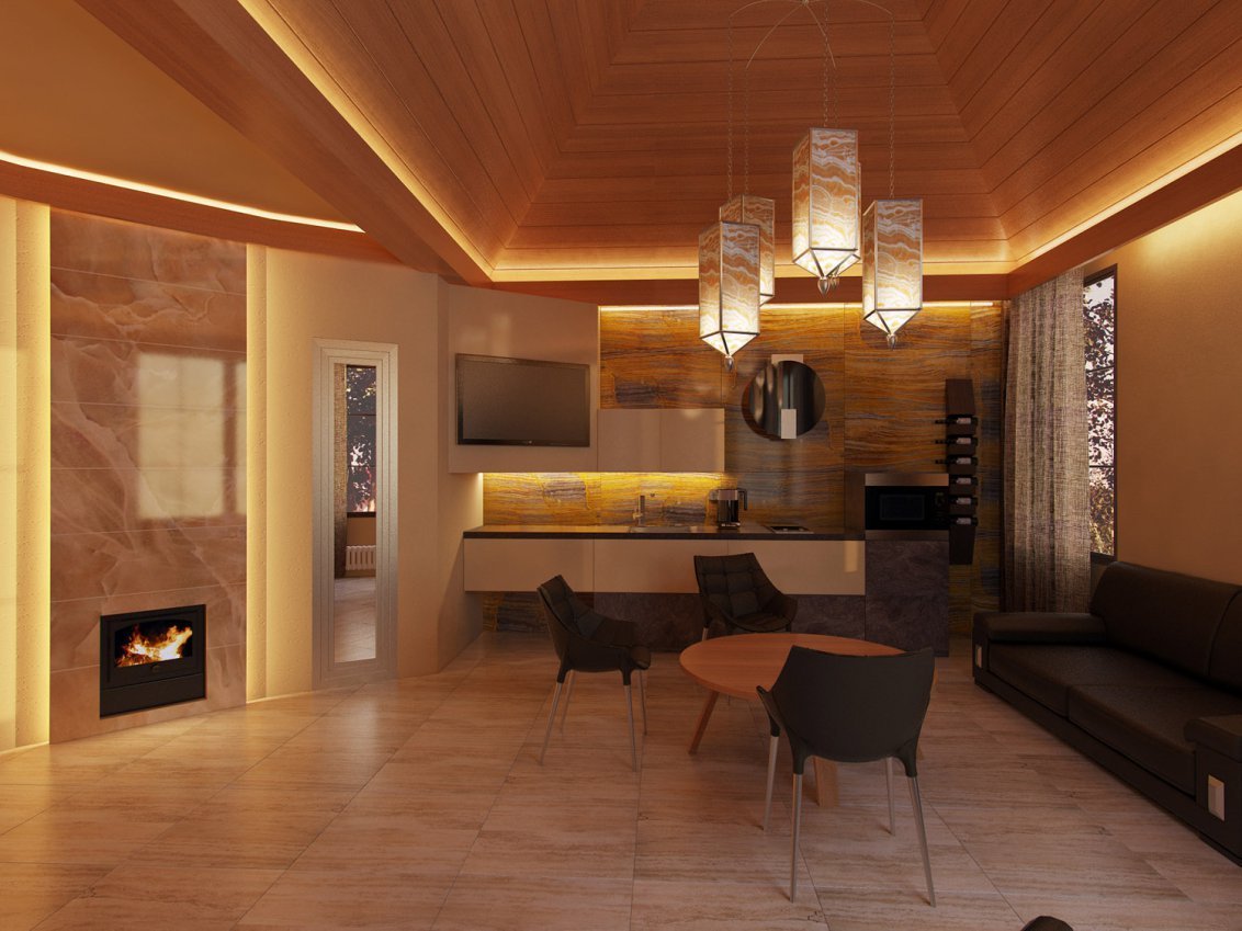 El conjunto de muebles estándar incluye sillones, un sofá o tumbona, una mesa, un soporte para TV, un armario para la ropa y posiblemente un rincón de cocina con barra de desayuno y el equipo necesario. En las opciones más caras, se instala un horno de barbacoa o una chimenea eléctrica en esta sala. El mobiliario de la habitación dependerá de las características del resto de los propietarios. Quizás a alguien le gusta cantar karaoke y bailar después de volar, mientras que a alguien le gusta dormir bajo el sonido tranquilo de la televisión.