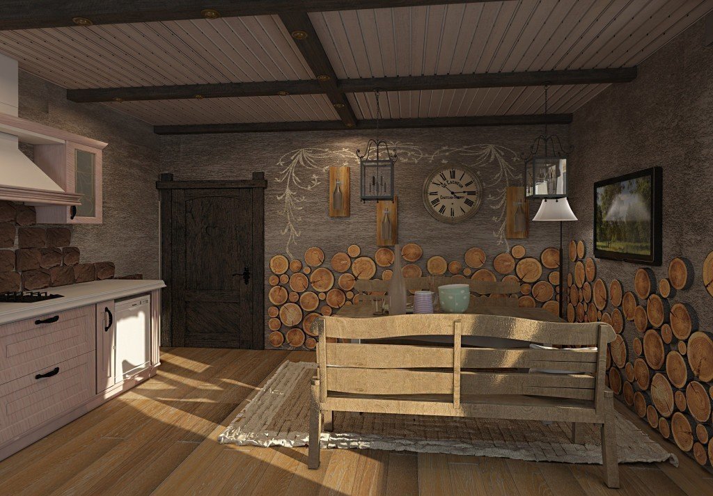 Un estilo rural prefiere materiales naturales con un acabado rugoso. El algodón se elige en textiles, y las superficies de madera prevalecen en la decoración. Es aconsejable dejar las vigas del techo en su forma original para enfatizar la originalidad de la situación. La habitación está decorada con cestas de mimbre, plantas de interior, muebles antiguos. Por ejemplo, un juego de cocina puede estar representado por un viejo gabinete de "abuela", que está ligeramente ennoblecido con pintura. Los platos son elegidos simples, sin dibujos y patrones. Los pisos están cubiertos con alfombras improvisadas. Cuadros y almohadas a cuadros, cosidos a partir de fragmentos multicolores, hacen alarde de sofás.