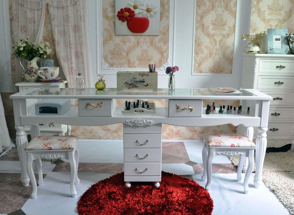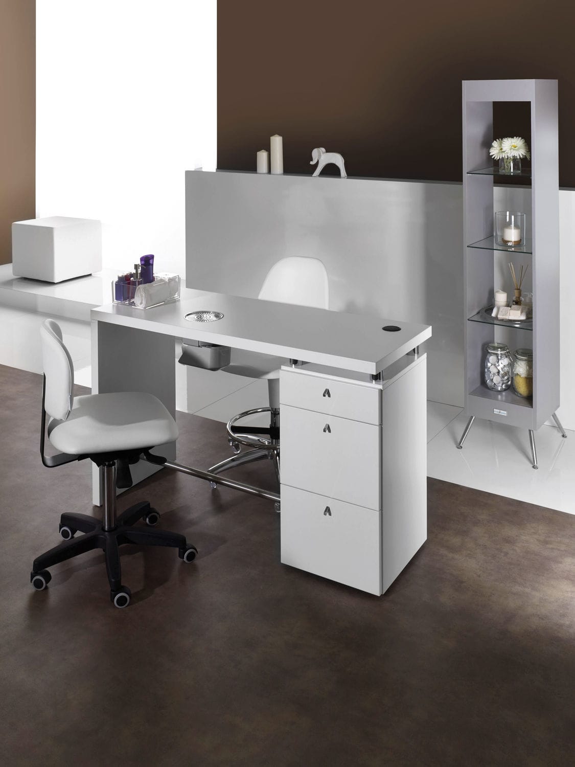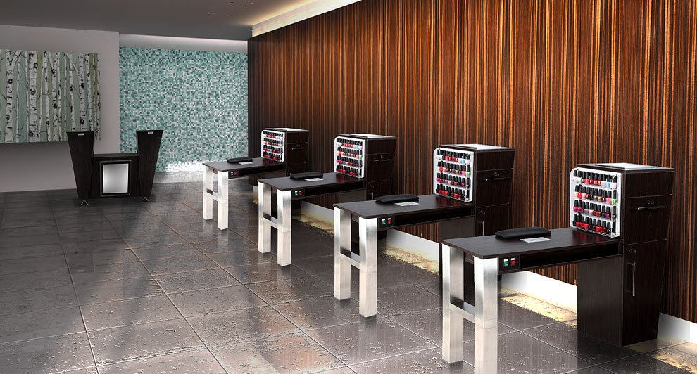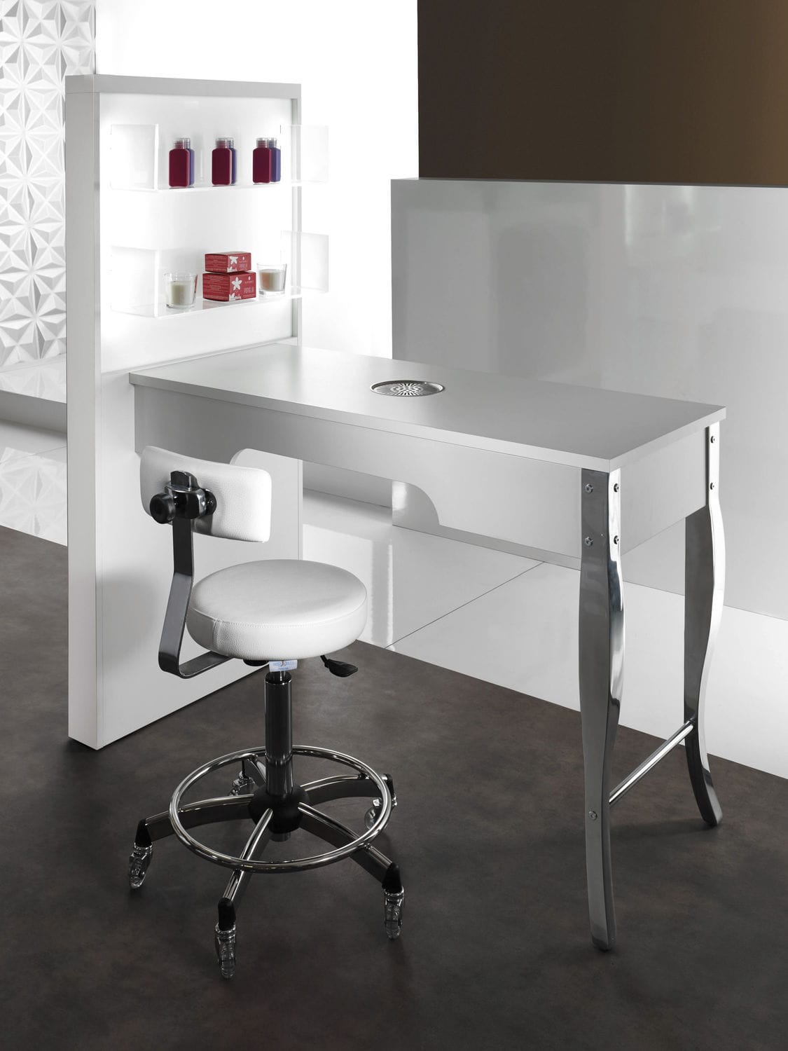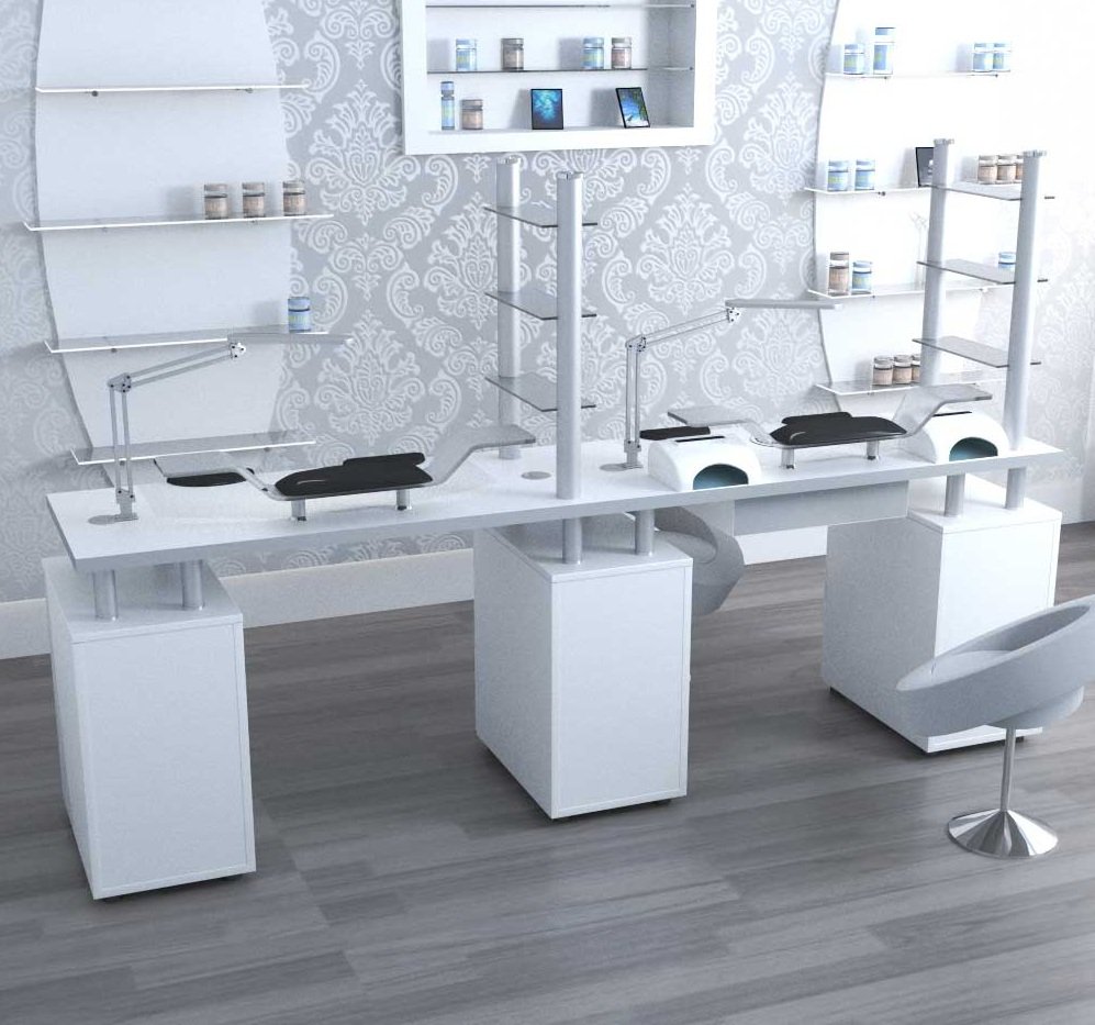 Mesas para manicura: hay modelos simples y dobles. Están equipados con gabinetes, campanas integradas en la encimera, lámparas de mesa, posavasos de laca y almohadas de mano;