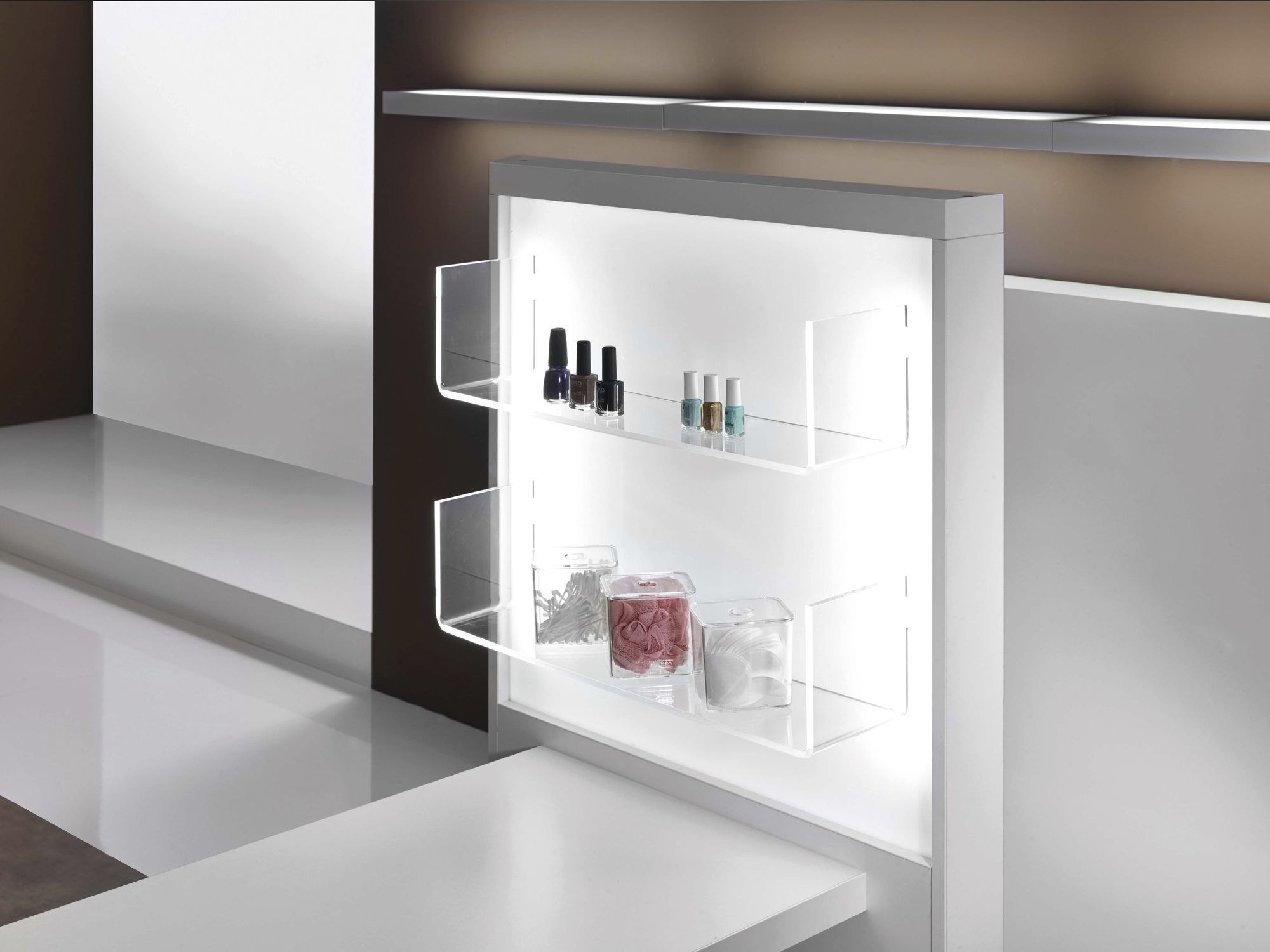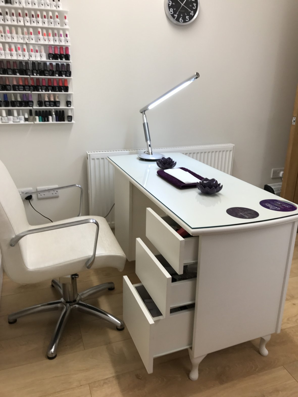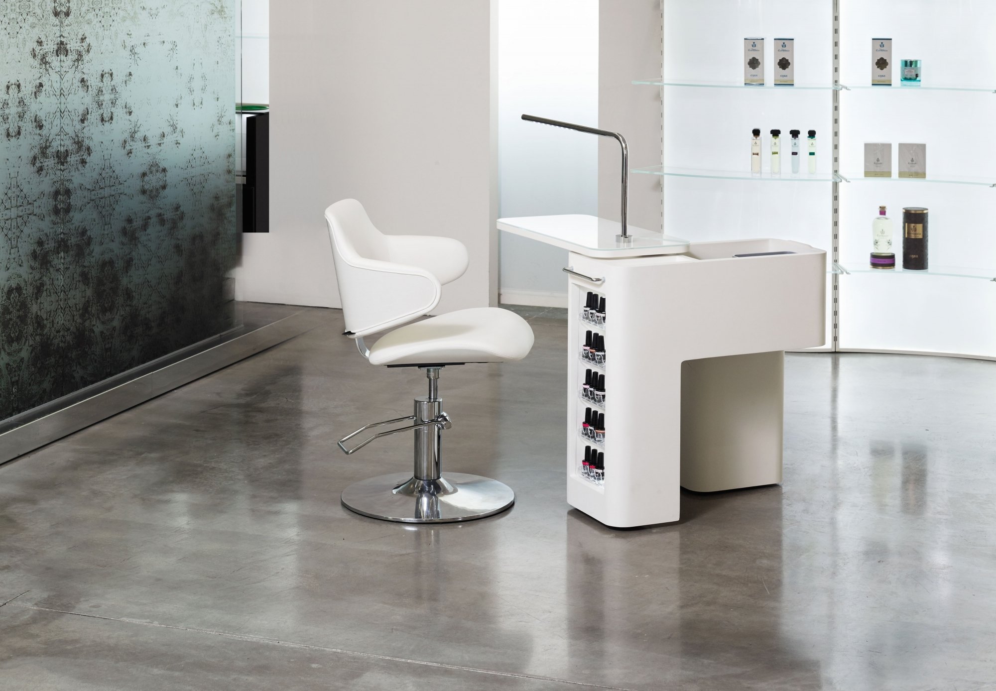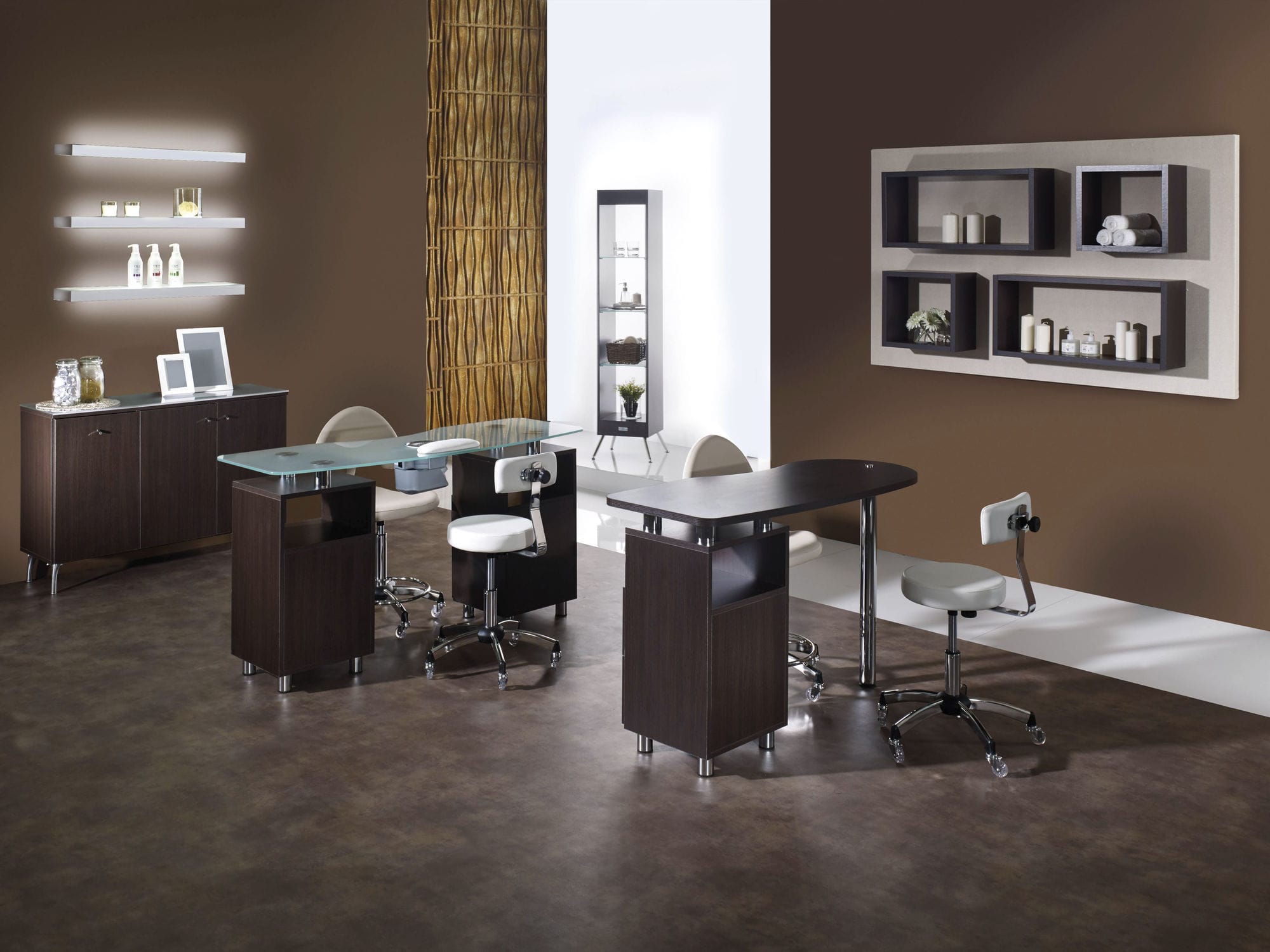Mesas para manicura: hay modelos simples y dobles. Están equipados con gabinetes, campanas integradas en la encimera, lámparas de mesa, posavasos de laca y almohadas de mano;