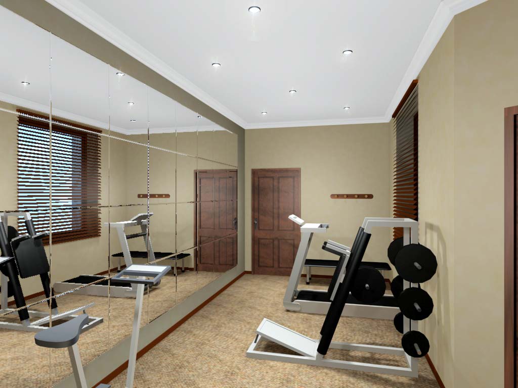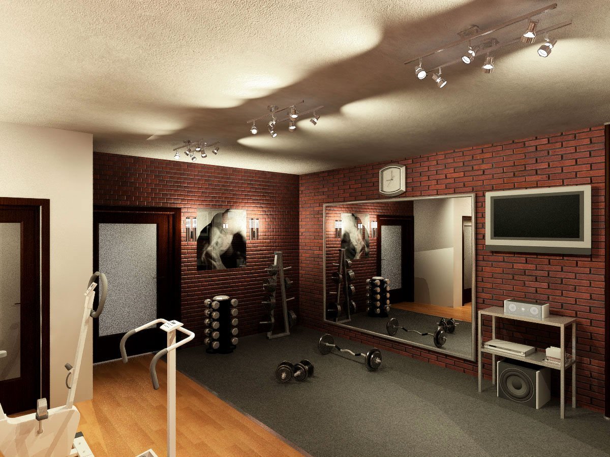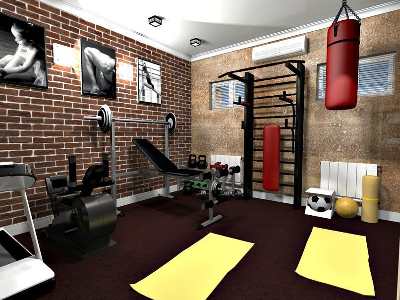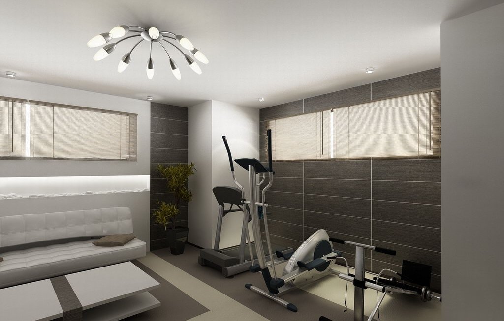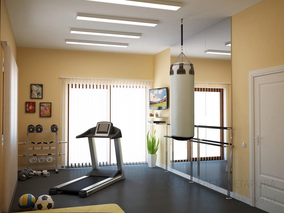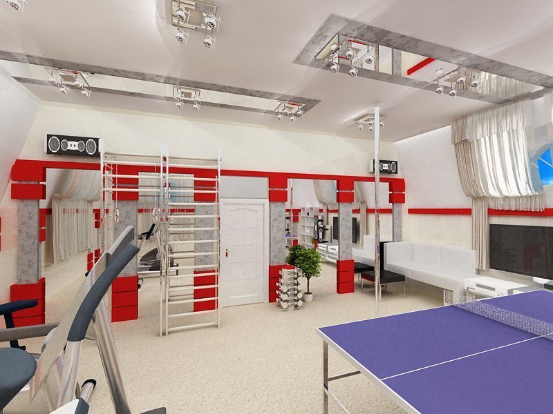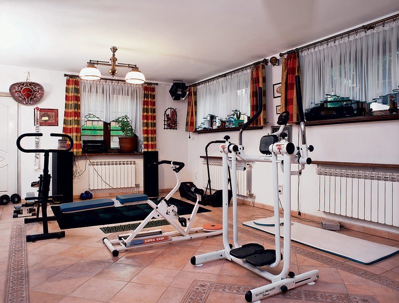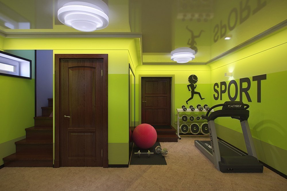 Para un complejo deportivo en casa, también puede usar el sótano o la planta baja. Pero al planificar estas habitaciones, se debe prestar especial atención a la iluminación y al sistema de ventilación.
