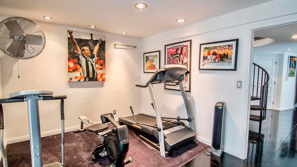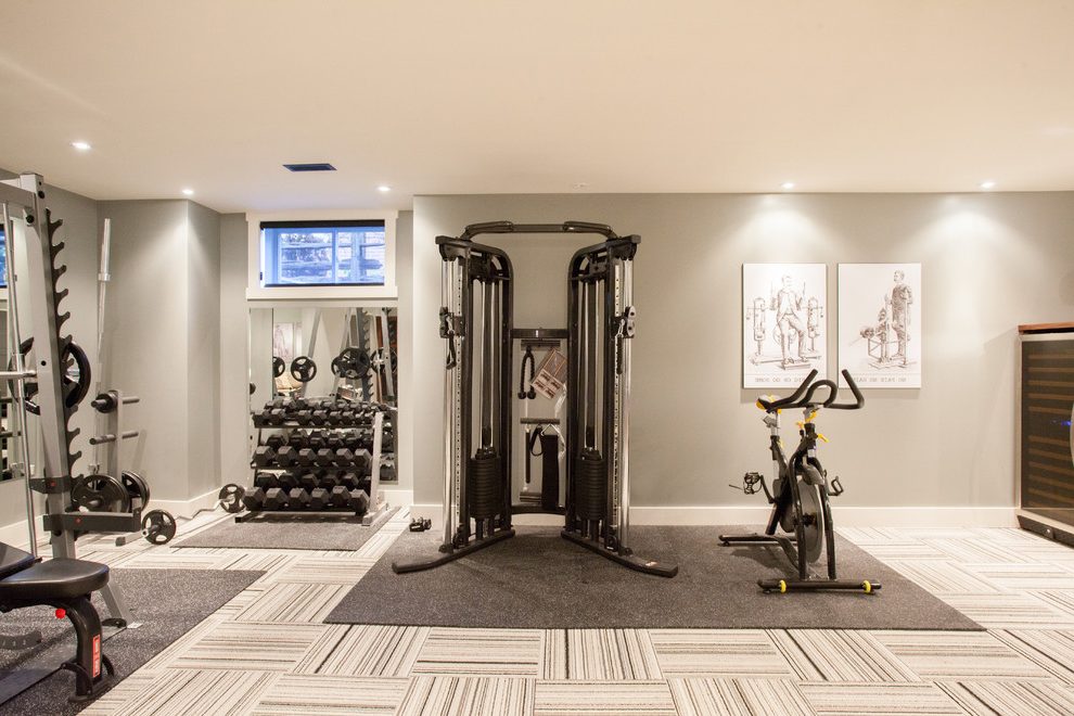 Los tonos negros y de acero encajan perfectamente en el estilo de alta tecnología y se ven orgánicos cuando se usan en una sala dedicada al gimnasio.