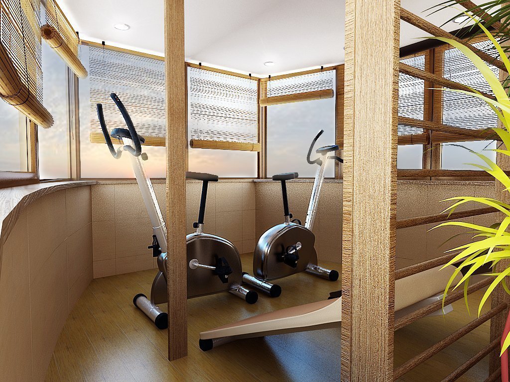 Es mejor asignar una zona para ejercicios de gimnasia cerca de la ventana para proporcionar al cuerpo el aire fresco necesario. Dar preferencia a las máquinas de ejercicio plegables. Con un entrenamiento regular, no son menos efectivos que sus homólogos estacionarios voluminosos, y ocupan muy poco espacio cuando se ensamblan.