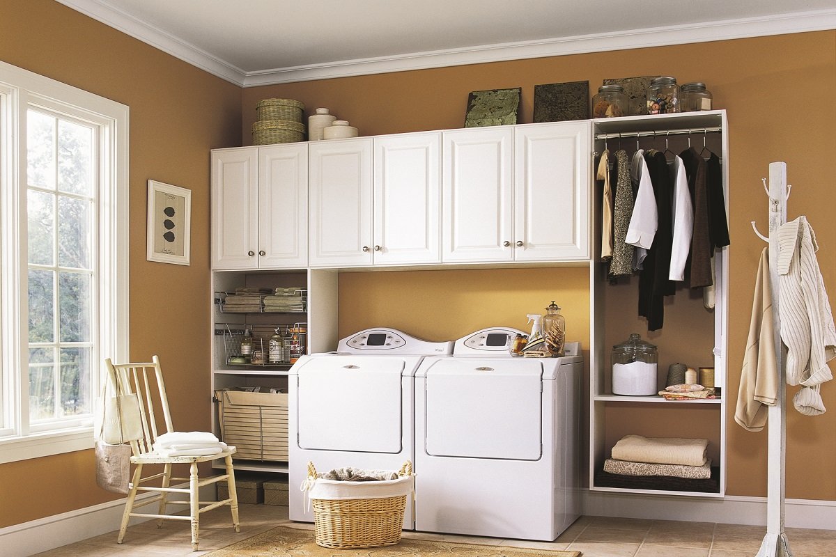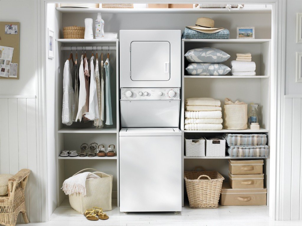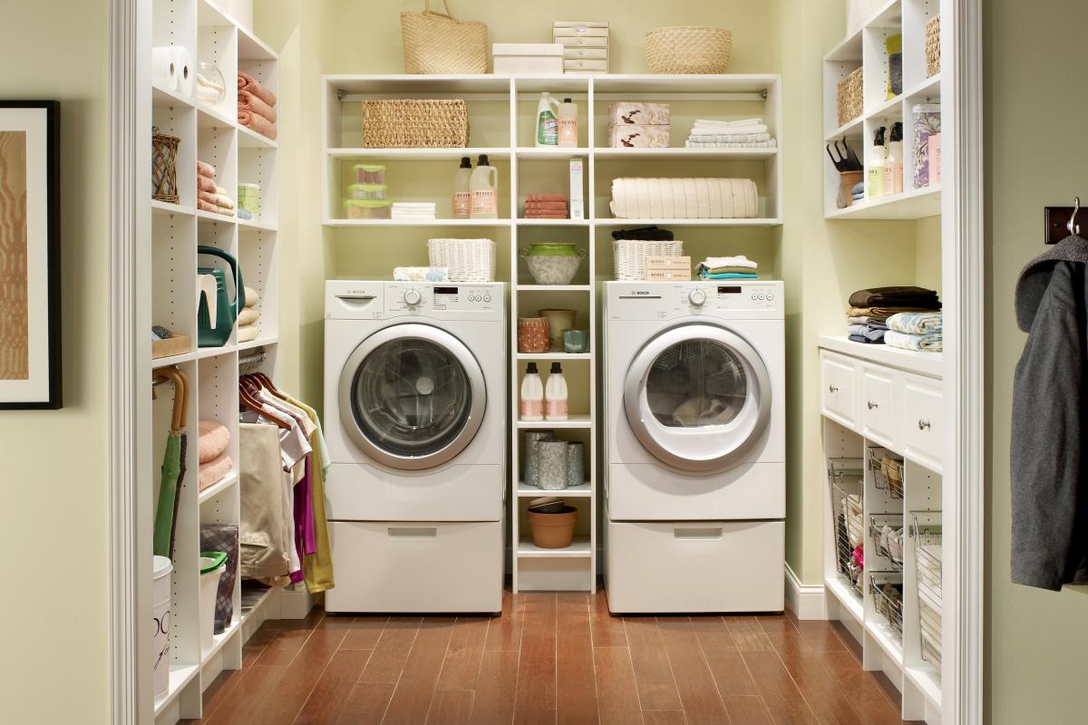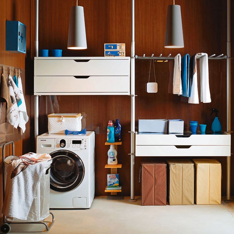 Una solución original y hermosa, debido a la cual será posible liberar el baño o la cocina de una carga excesiva. El cuarto de lavado se divide en tres niveles. En la parte inferior poner una o dos lavadoras. La segunda opción es siempre mejor: no habrá necesidad de organizar una cola. El segundo nivel es para la cama, almohadas, ropa. Aquí también colocamos detergentes y polvos al margen.En el tercero hay cajas con varios artículos, incluidos aquellos que necesitan un lavado periódico. Se coloca una canasta de ropa sucia en el piso.