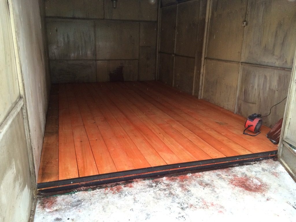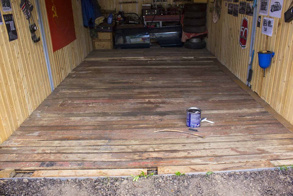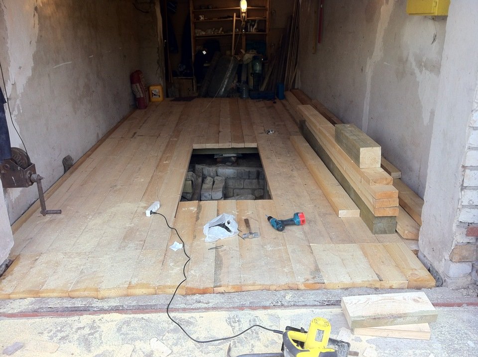las tablas del piso se colocan y se clavan en el rezago; debe hacerlo desde los bordes del orificio de inspección hasta las paredes del garaje;