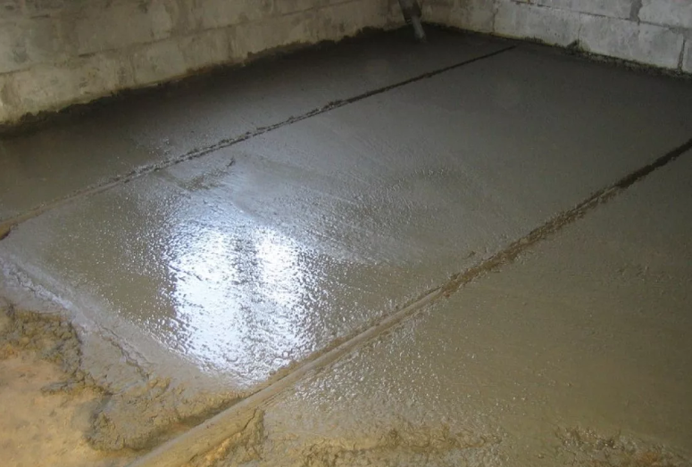 Antes del inicio del vertido, el marcado se realiza utilizando columnas metálicas clavadas en el suelo. Marcan la altura de la regla propuesta, utilizando el nivel de construcción. La solución semilíquida lista se vierte sobre la base, distribuida uniformemente en toda su área.