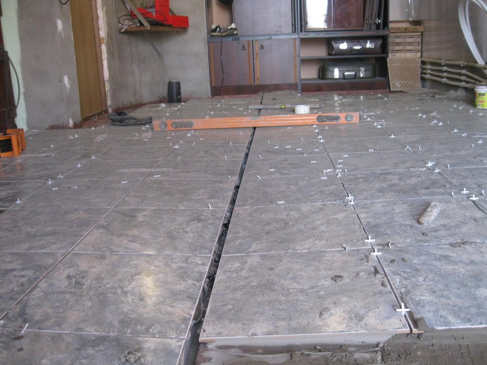 La base para colocar materiales de baldosas está hecha lo más uniforme posible, sin protuberancias, cavidades ni grietas. La alineación de grandes defectos se lleva a cabo con mortero de cemento, antes de esto, se pega una cinta de compensación a lo largo del perímetro de las paredes, luego se nivelan.