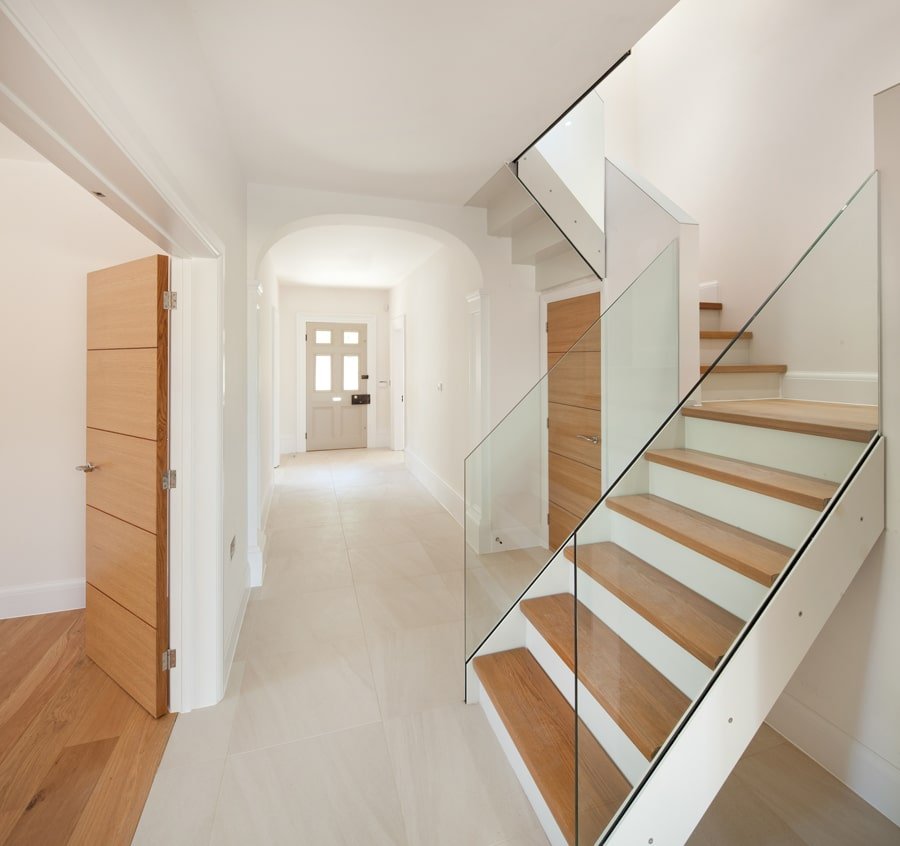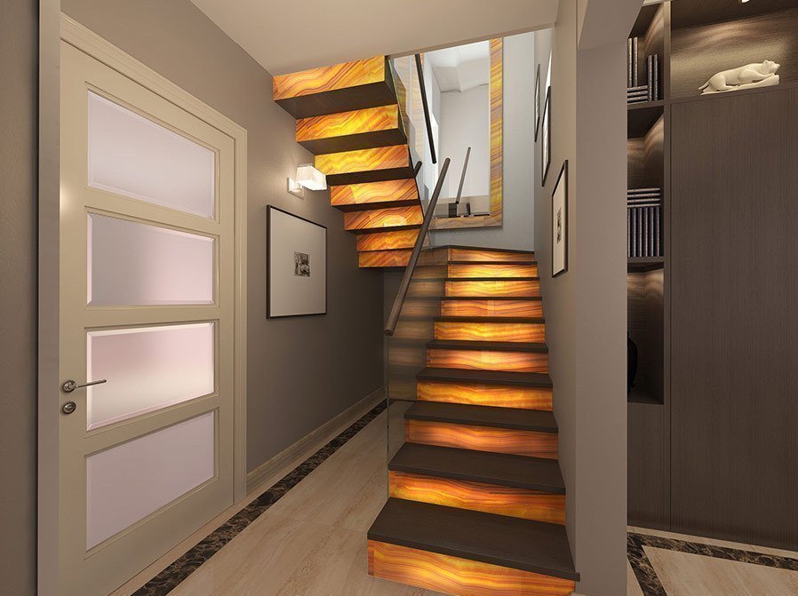 En este caso, el papel de las escaleras en el interior es secundario. En este caso, es mucho más importante organizar el espacio de la sala. El acabado se elige para que armonice con el estilo y los materiales del pasillo. Los materiales para terminar el tramo de escaleras pueden ser cualquier cosa: desde mármol clásico hasta vidrio coloreado en un rendimiento resistente al impacto.