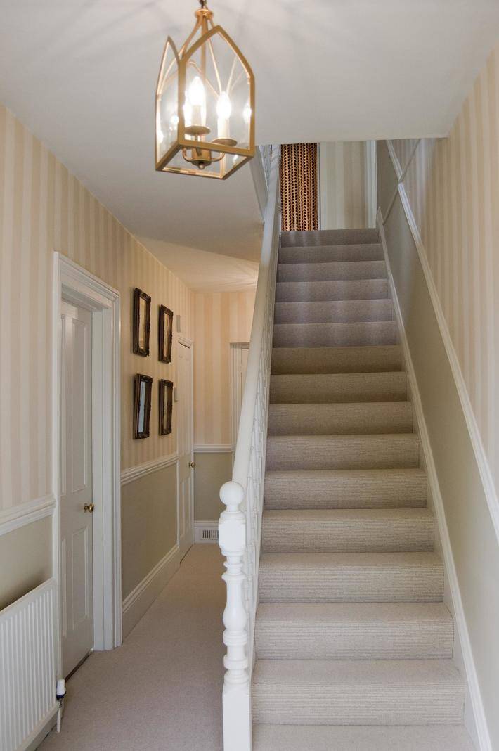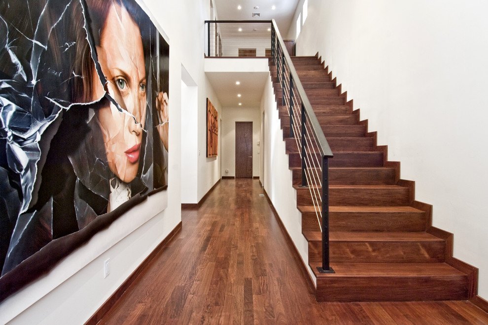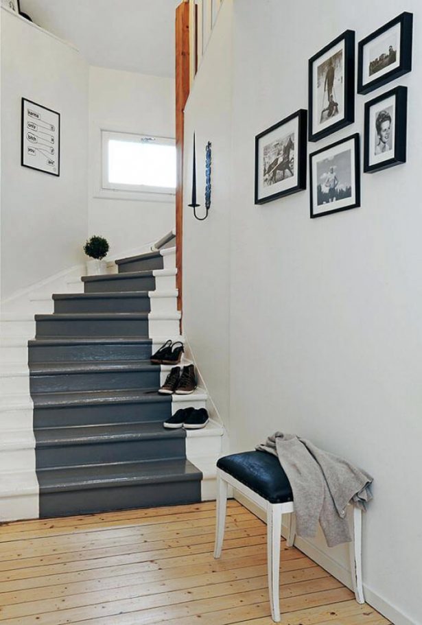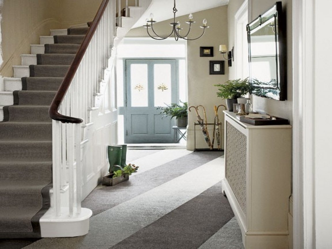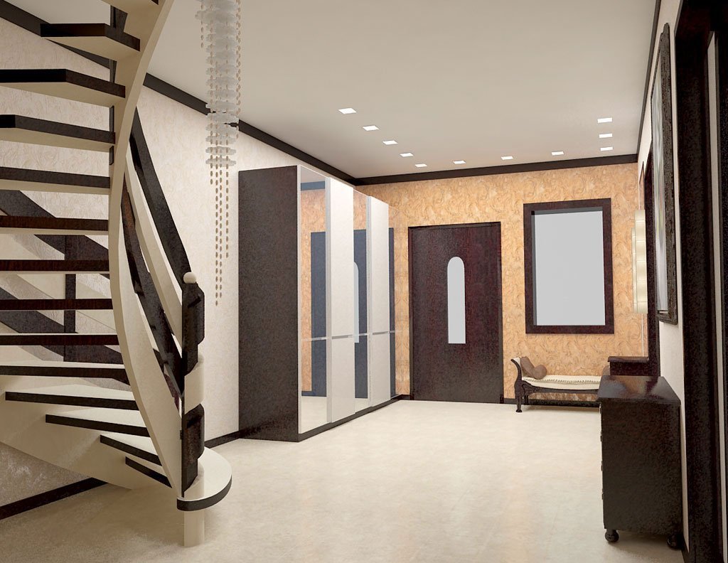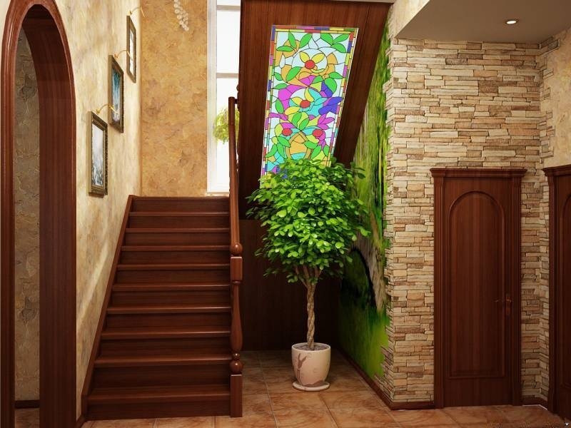 Al decorar un pasillo con una escalera, tales opciones de estilo de casa son posibles.