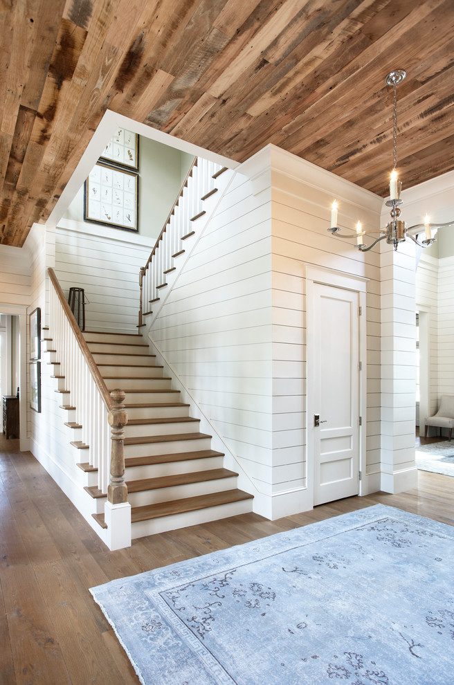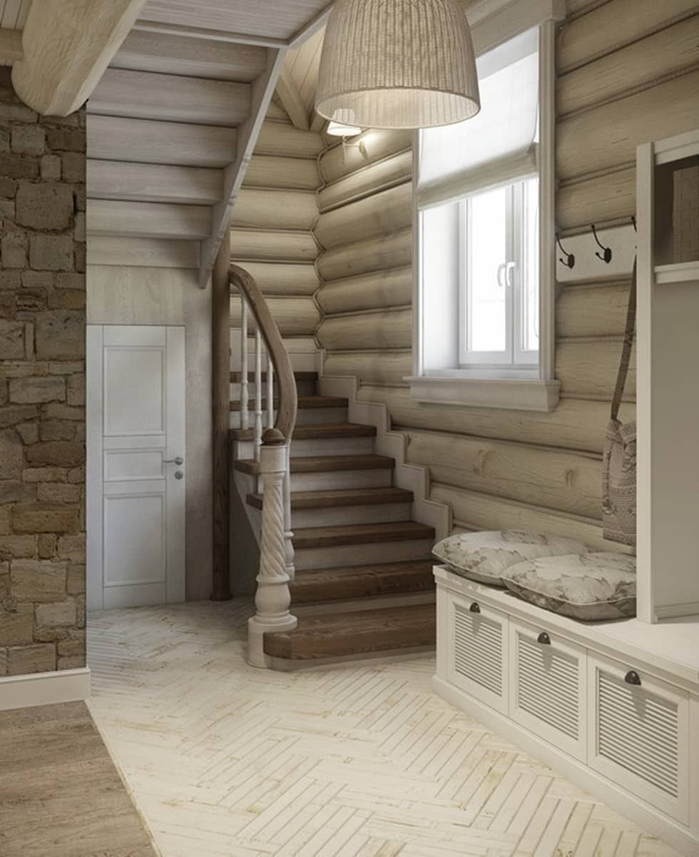 La escalera de madera al segundo piso y el ático, combinada con la decoración del vestíbulo de la casa de campo con tablillas, es de estilo rústico.