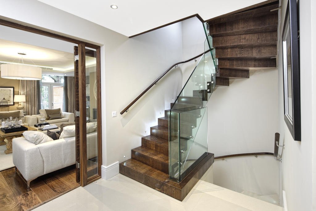 Este es un enfoque innovador para el diseño de escaleras. En este caso, no se usan ordinarios, pero se utilizan calidades de vidrio multicapa y de alta resistencia. El diseño es sólido, hermoso y elegante al aire, pero para algunas personas el descenso y el ascenso causan miedo. Las cercas de vidrio son pasos más comunes.