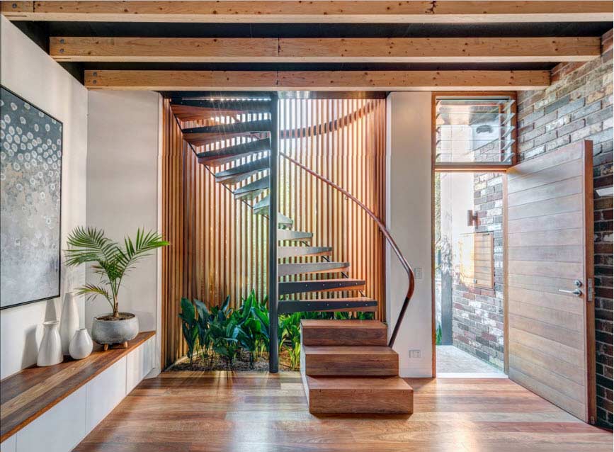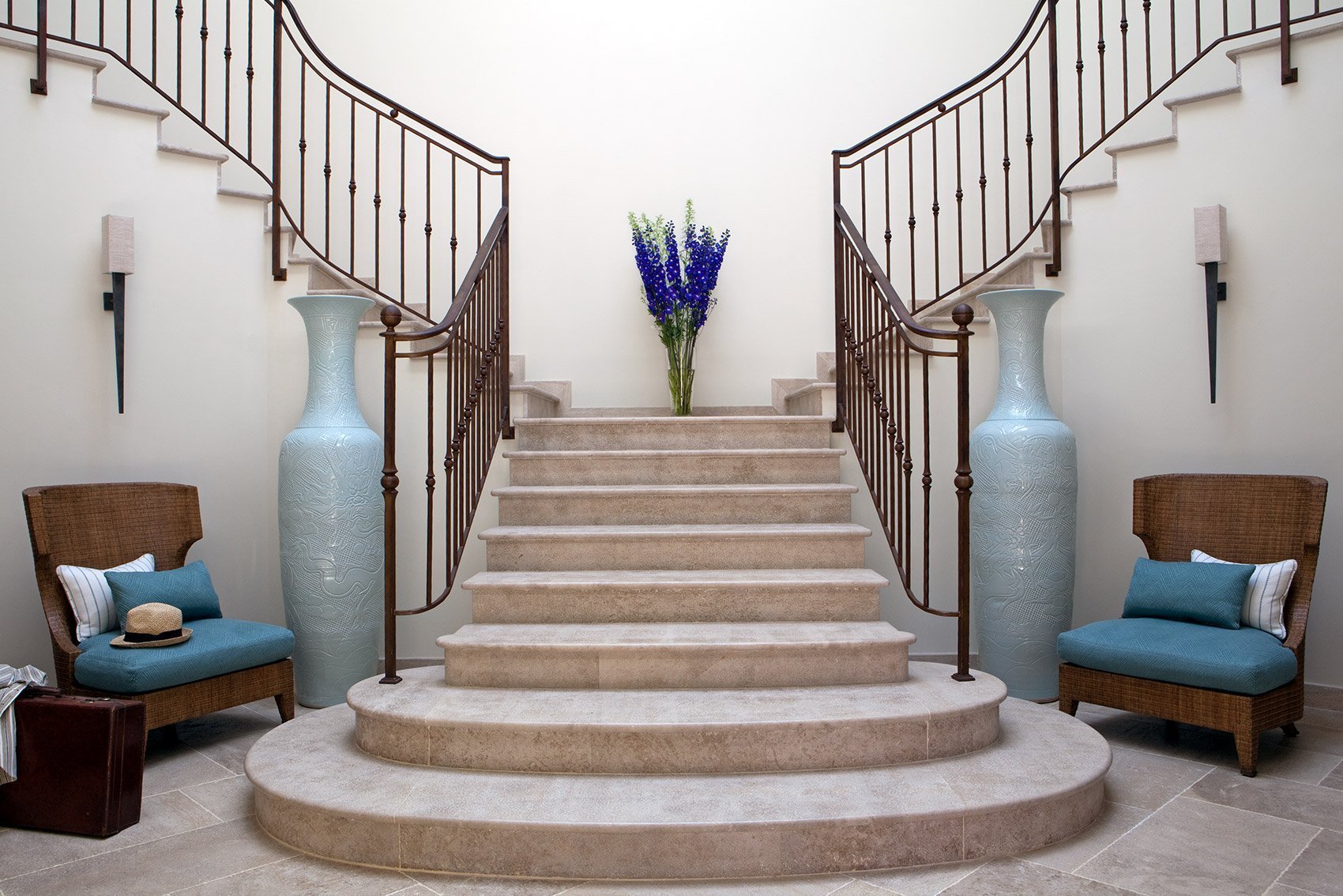 El vestíbulo de la casa privada, decorada con piedra, y la escalera de hierro forjado forman un encantador conjunto mediterráneo.
