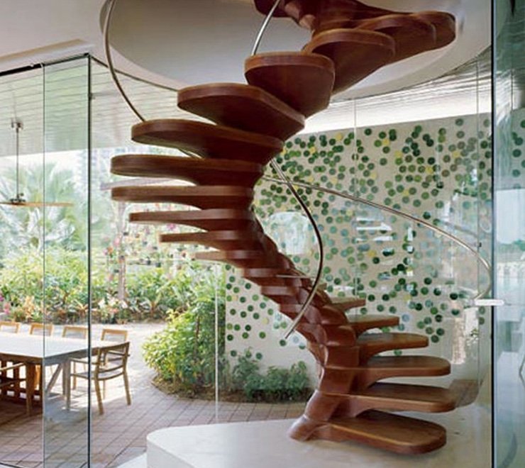 Una escalera de caracol curiosamente curva se combina perfectamente con el estilo moderno. Los marcos de las ventanas, los marcos de las puertas y las barandas están hechos de la misma especie de madera y decorados con un patrón idéntico.
