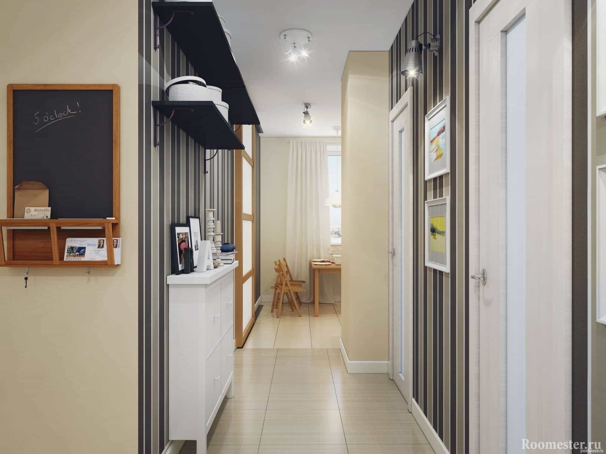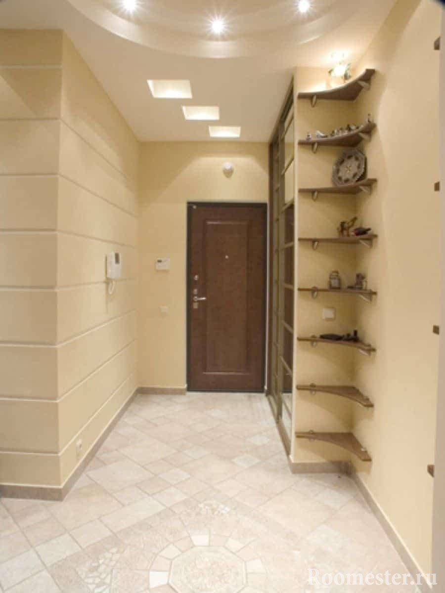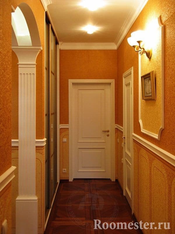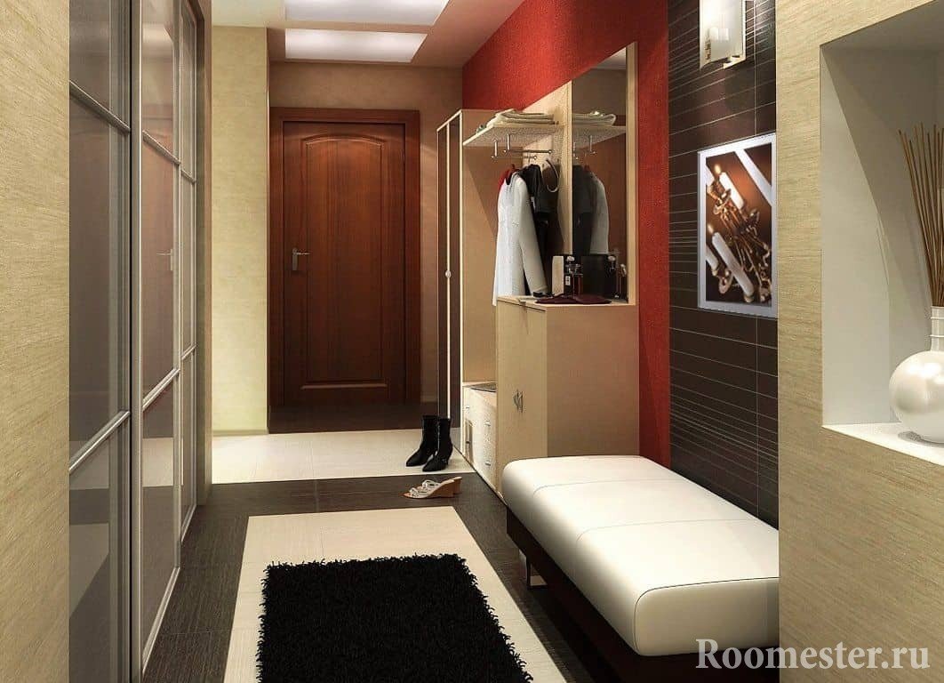 Estrecho Las paredes están cerca, creando un pasaje estrecho. El lugar para moverse es pequeño. Poner muebles es casi imposible. Es necesario colocar una percha. Se debe colocar una pequeña cómoda o un estante a lo largo de esta pared. Se necesita papel tapiz con un patrón pequeño, o tonos claros y claros. El techo está pintado de blanco para parecer alto. Puede hacer techos tensados con iluminación incorporada. Por lo tanto, se realizan dos trabajos a la vez. El acabado del piso se realiza con parquet, laminado, linóleo.