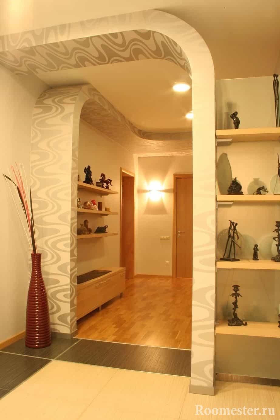 El diseño del corredor con la transición a las habitaciones de los apartamentos permite la elección de papel tapiz líquido, no tejido y de papel. Son transpirables, lo que permite que las paredes respiren. Todos son adecuados para el diseño de un pasillo estrecho y rectangular.