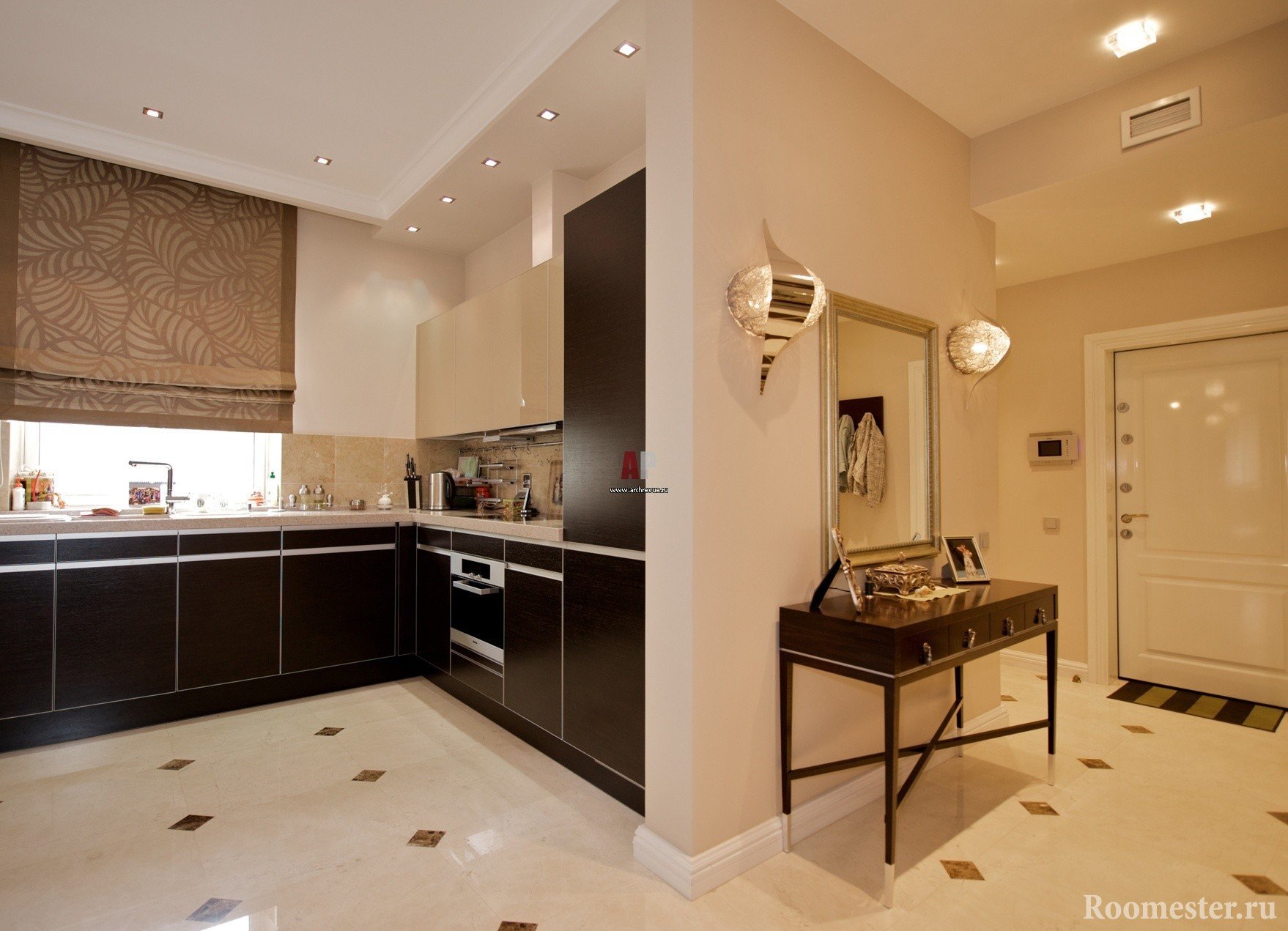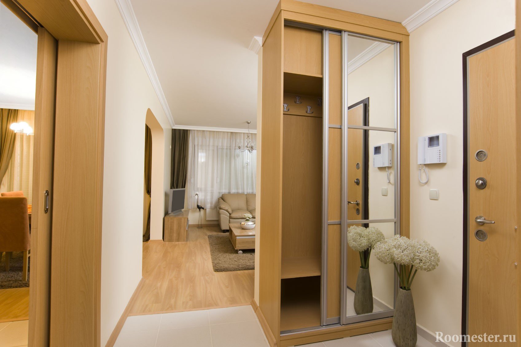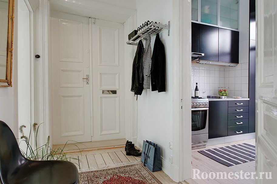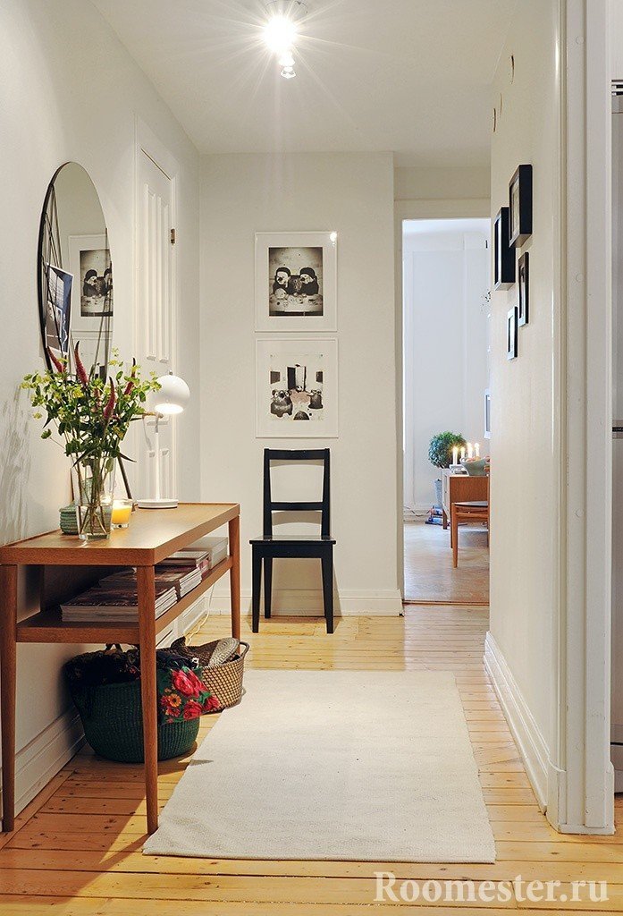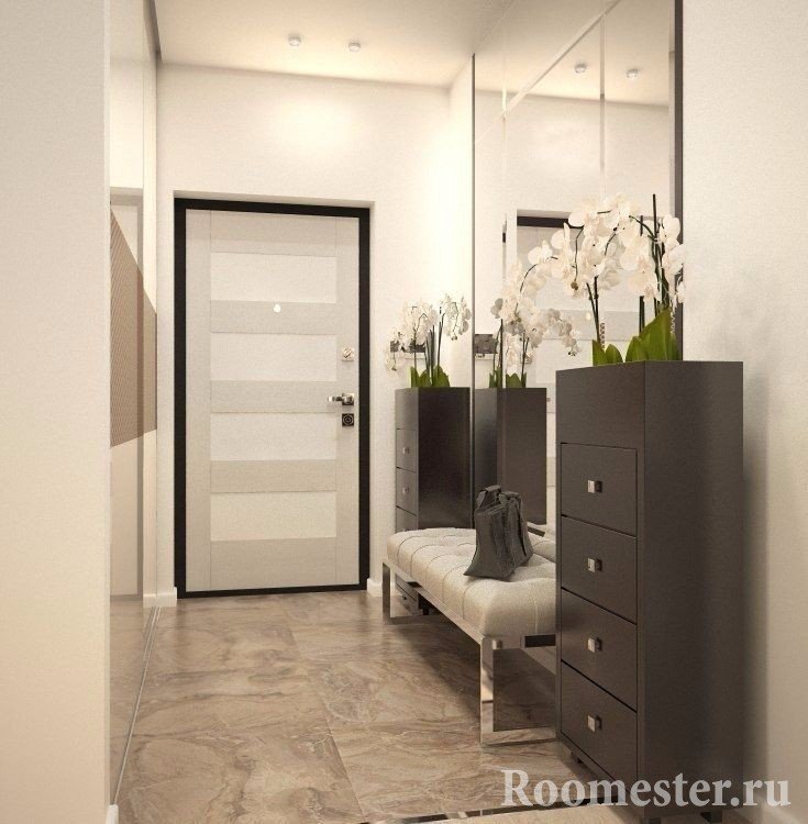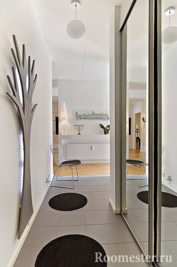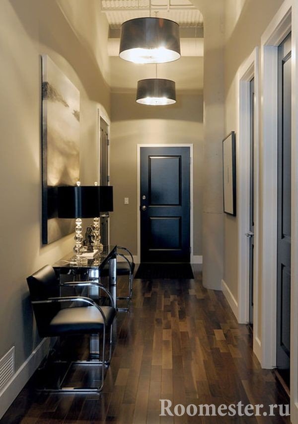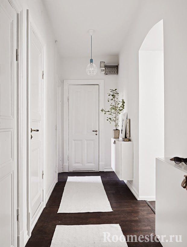 Corredor. Es característico en casas de paneles. Las características de diseño son la necesidad de expansión visual de un espacio estrecho;