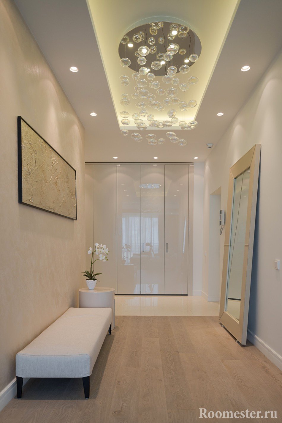 Al organizar la iluminación en el vestíbulo, se recomienda evitar la formación de sombras, ya que reducirán aún más el espacio modesto. En base a esto, el techo debería dispersar la luz, nivelar el juego del claroscuro. La superficie aligerada de los colores pastel hará frente mejor a esto. En la versión coupé, se permite el uso de un techo con espejo. En el "cuadro" es bastante aplicable la tensión. Uno de los materiales más populares para decorar el techo es el panel de yeso. Su uso implica un mínimo de accesorios, lo que afectará positivamente los costos de los servicios públicos.Para obtener la luz adecuada, debe organizar un nicho ovalado en la superficie del techo.