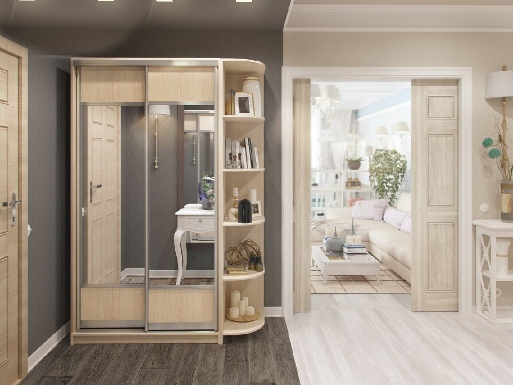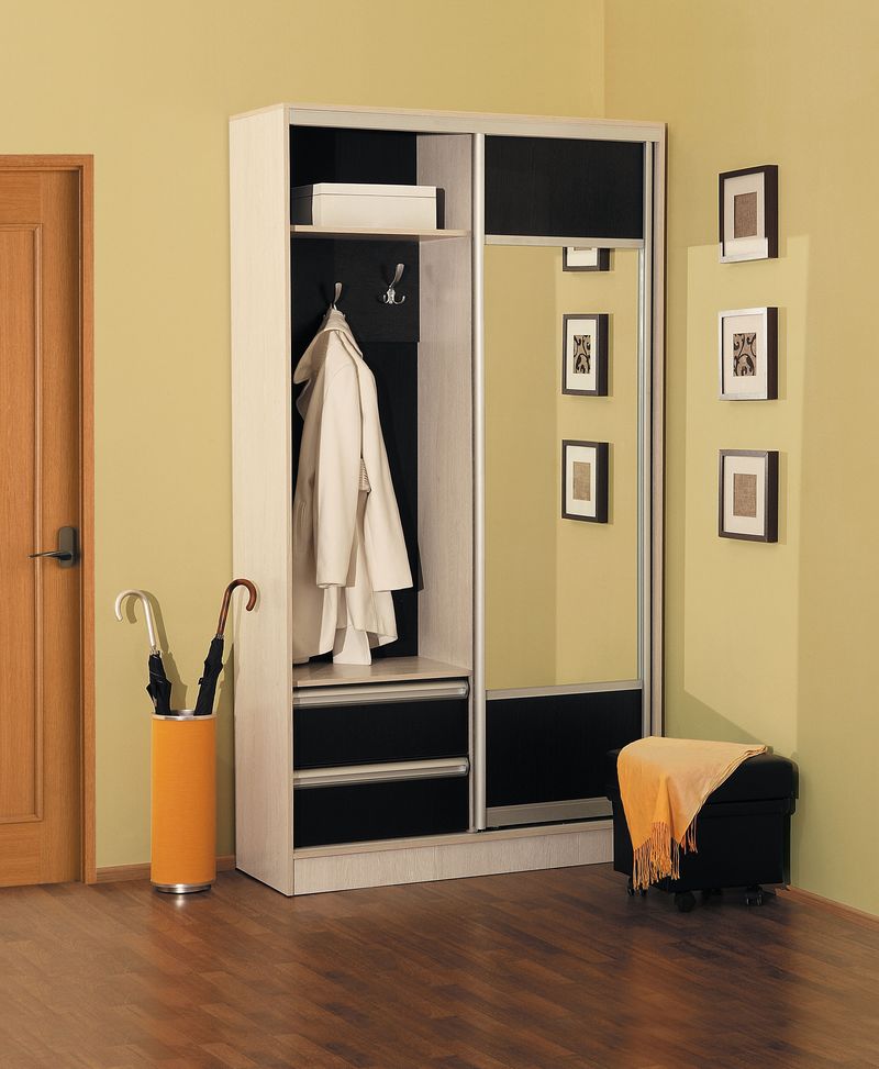 Dado que el casillero con bisagras ocupará mucho espacio en un corredor de tamaño pequeño, sería una decisión razonable reemplazarlo con un moderno armario deslizante. Un modelo espacioso puede ser recto si el pasillo entra inmediatamente en el pasillo o esquina, si el pasillo es un pequeño rectángulo o cuadrado, convirtiéndose en un pasillo estrecho. Para un pequeño armario deslizante, el relleno de una serie de estantes, compartimentos con un microelevador y cajones será apropiado. Un gabinete grande puede incluir además compartimentos, cestas, perchas para cinturones, corbatas.Un modelo con estantes externos será conveniente: son adecuados para almacenar llaves, bolsos y diversos adornos. Si hay un nicho en el pasillo o corredor, se recomienda elegir armarios empotrados. Además, en este nicho, los propietarios pueden organizar una pequeña percha colgante enmarcada por un par de estuches. En la parte inferior, se recomienda colocar un banco grande con un compartimento interno para guardar los zapatos.