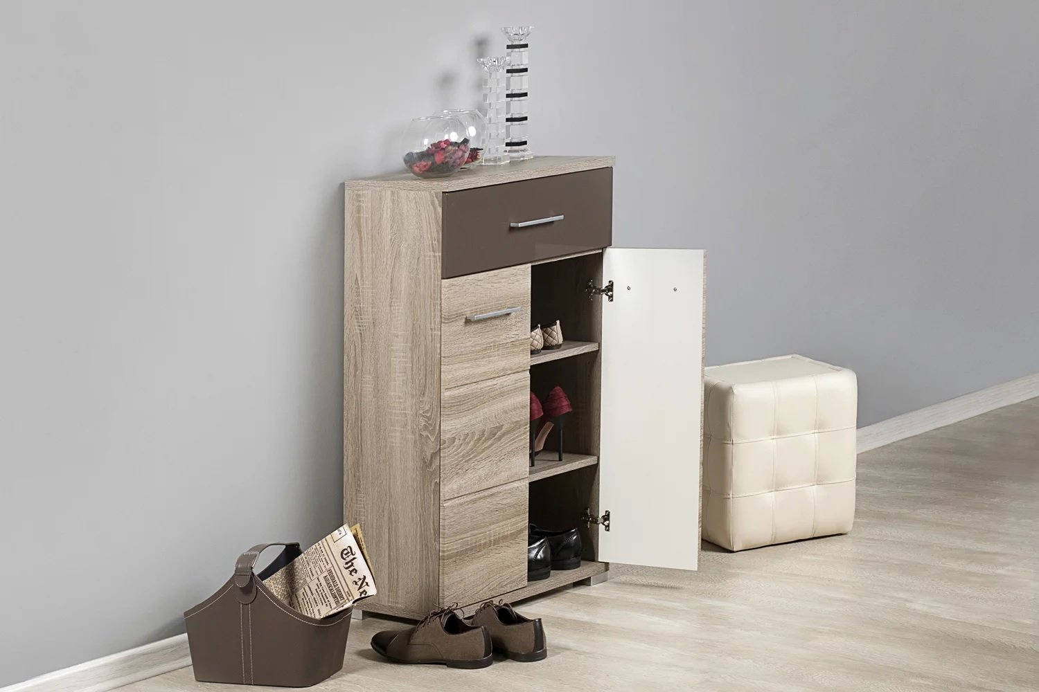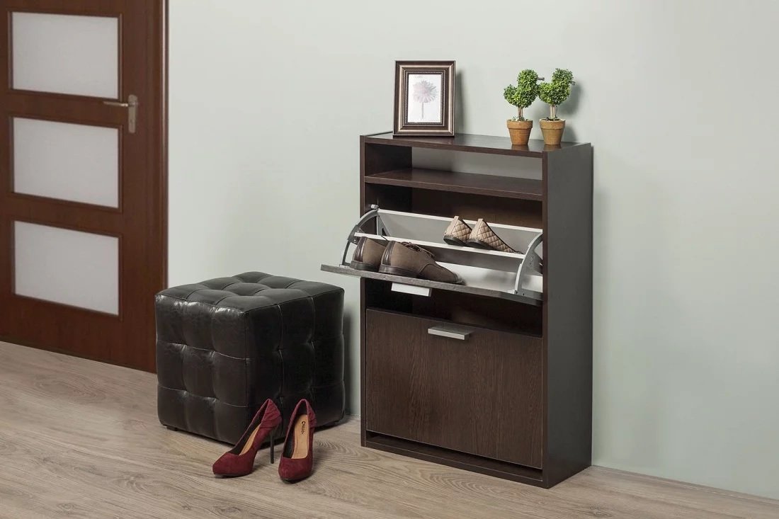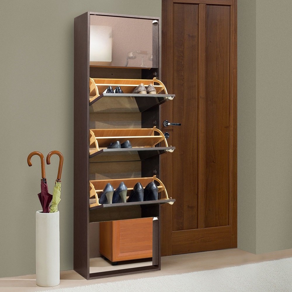 Muchos bastidores de zapatos modernos tienen pequeñas dimensiones externas y son muy similares a las cajoneras. Dichos modelos con poca profundidad se complementan con numerosos compartimentos biselados, donde es conveniente colocar una gran cantidad de zapatos.