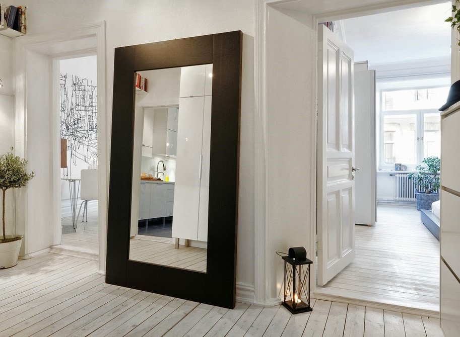Un espejo colgante original o un espejo de pie en un marco con patas permitirá a los propietarios ordenar fácilmente antes de salir y evaluar los conjuntos seleccionados. Además, los espejos grandes aumentarán visualmente el área del corredor.