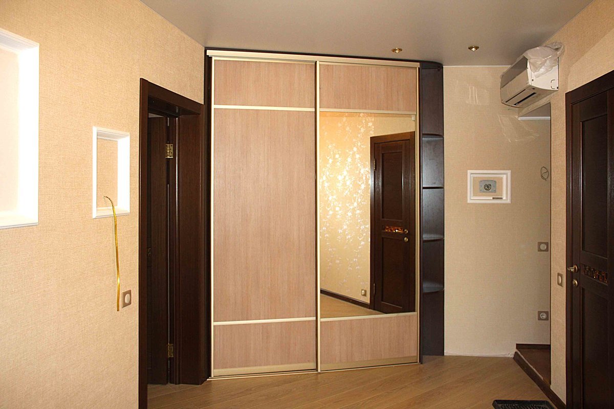 El amplio frente está decorado con un gran armario. Cuando la habitación tiene forma cuadrada, la instalación de dos estructuras de esquina simétricas es aceptable. Esto tiene sentido si el apartamento tiene una familia numerosa con muchas cosas. En una esquina, la ropa con zapatos se almacena aquí, en la otra: diversos utensilios domésticos, equipos deportivos, pequeños electrodomésticos, etc. También es aceptable un casillero en forma de L o de radio. Este último está convenientemente ubicado entre dos puertas que conducen a habitaciones separadas. El diseño de la caja también es adecuado. Consejo: cuando el área del pasillo es de 10 a 15 o más "cuadrados", es fácil equipar un armario de esquina completo.