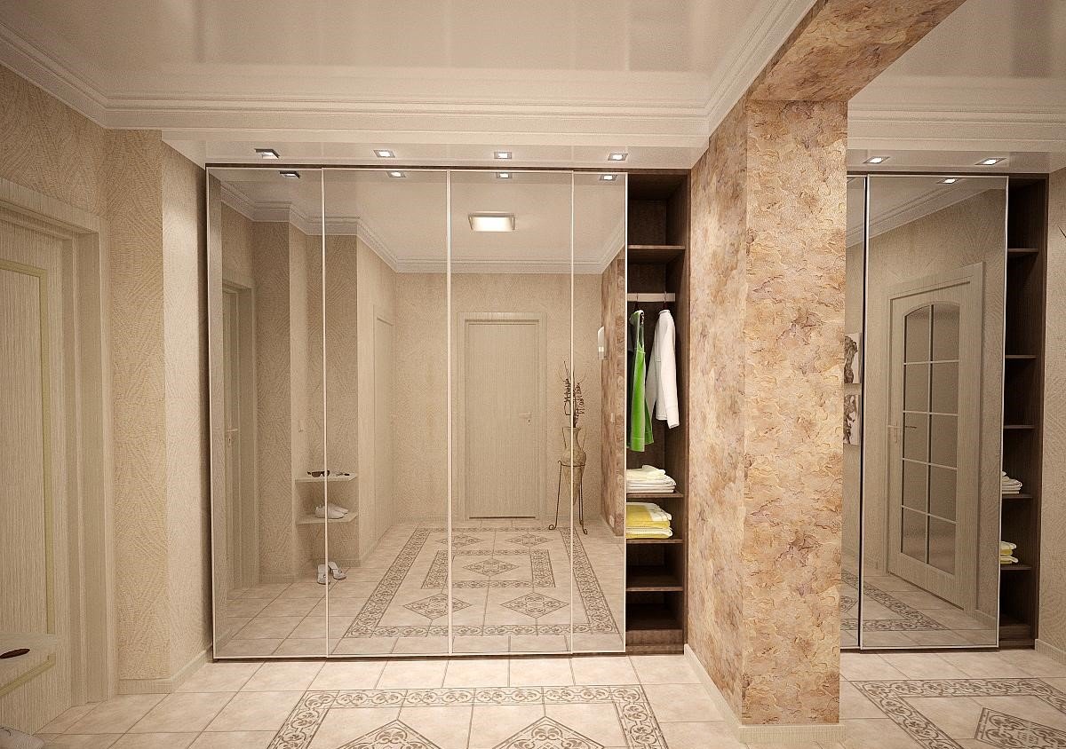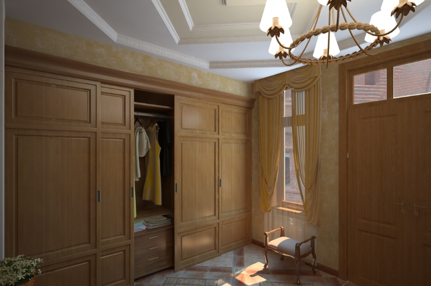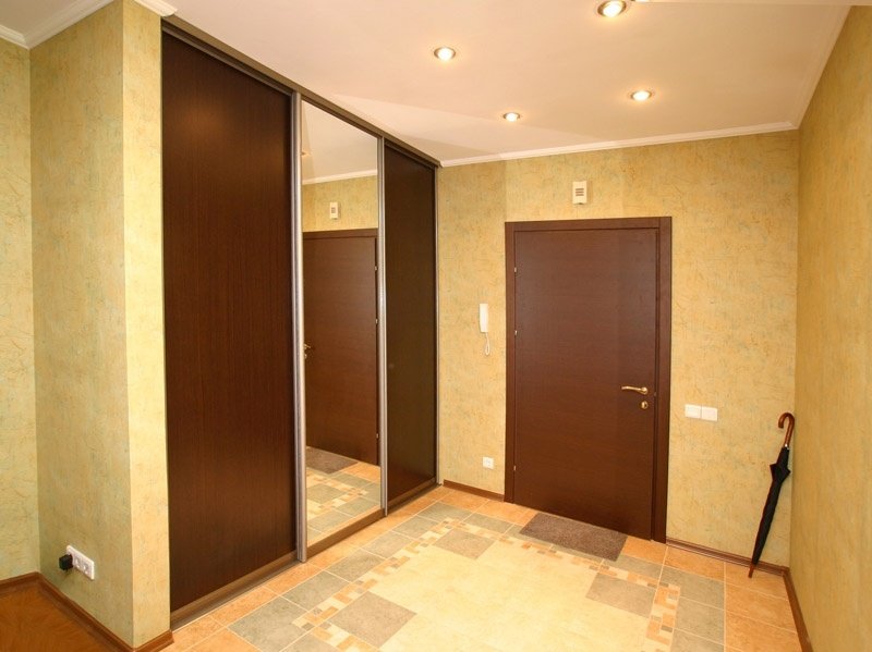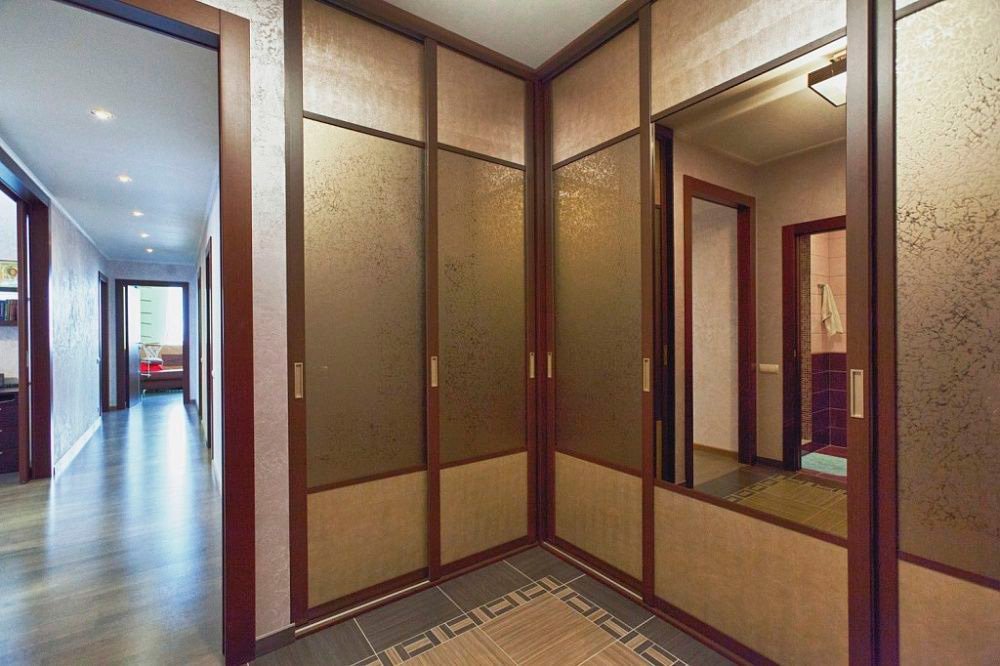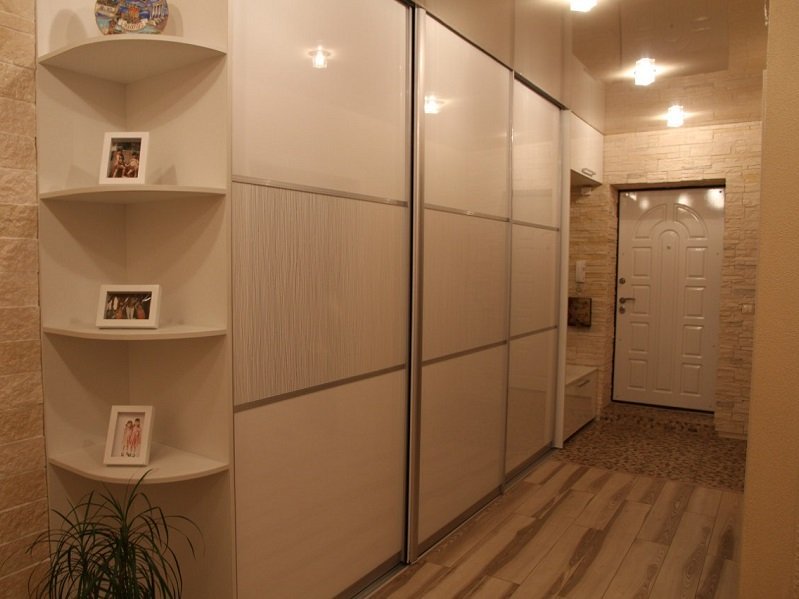 El amplio frente está decorado con un gran armario. Cuando la habitación tiene forma cuadrada, la instalación de dos estructuras de esquina simétricas es aceptable. Esto tiene sentido si el apartamento tiene una familia numerosa con muchas cosas. En una esquina, la ropa con zapatos se almacena aquí, en la otra: diversos utensilios domésticos, equipos deportivos, pequeños electrodomésticos, etc. También es aceptable un casillero en forma de L o de radio. Este último está convenientemente ubicado entre dos puertas que conducen a habitaciones separadas. El diseño de la caja también es adecuado.