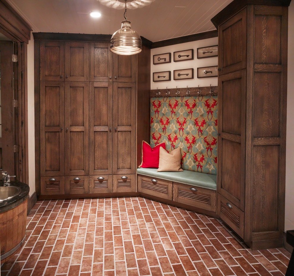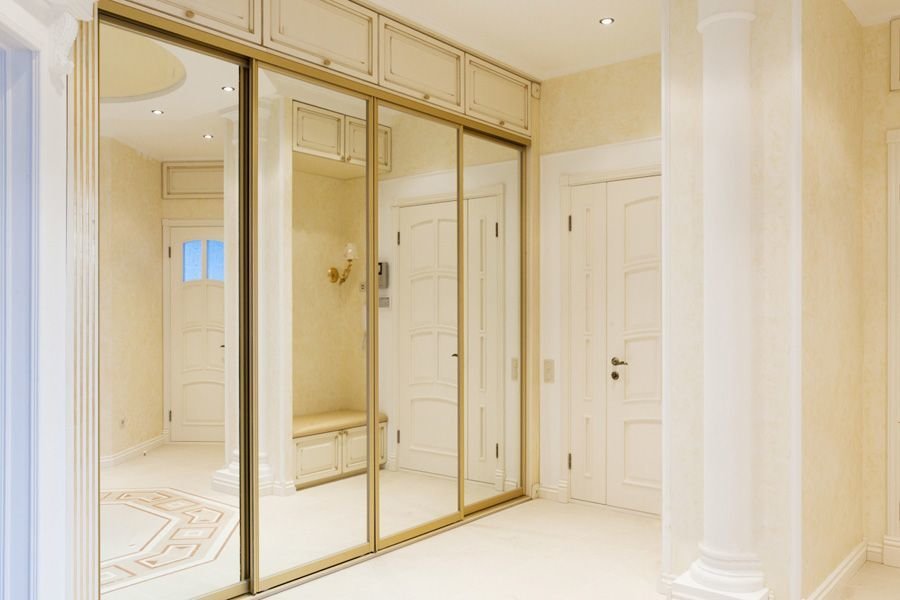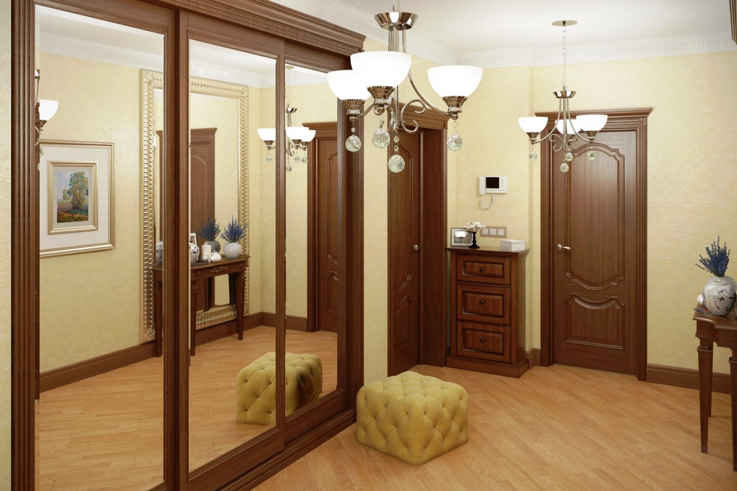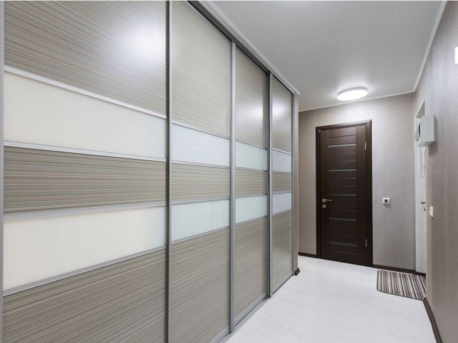 El amplio frente está decorado con un gran armario. Cuando la habitación tiene forma cuadrada, la instalación de dos estructuras de esquina simétricas es aceptable. Esto tiene sentido si el apartamento tiene una familia numerosa con muchas cosas. En una esquina, la ropa con zapatos se almacena aquí, en la otra: diversos utensilios domésticos, equipos deportivos, pequeños electrodomésticos, etc. También es aceptable un casillero en forma de L o de radio. Este último está convenientemente ubicado entre dos puertas que conducen a habitaciones separadas. El diseño de la caja también es adecuado.