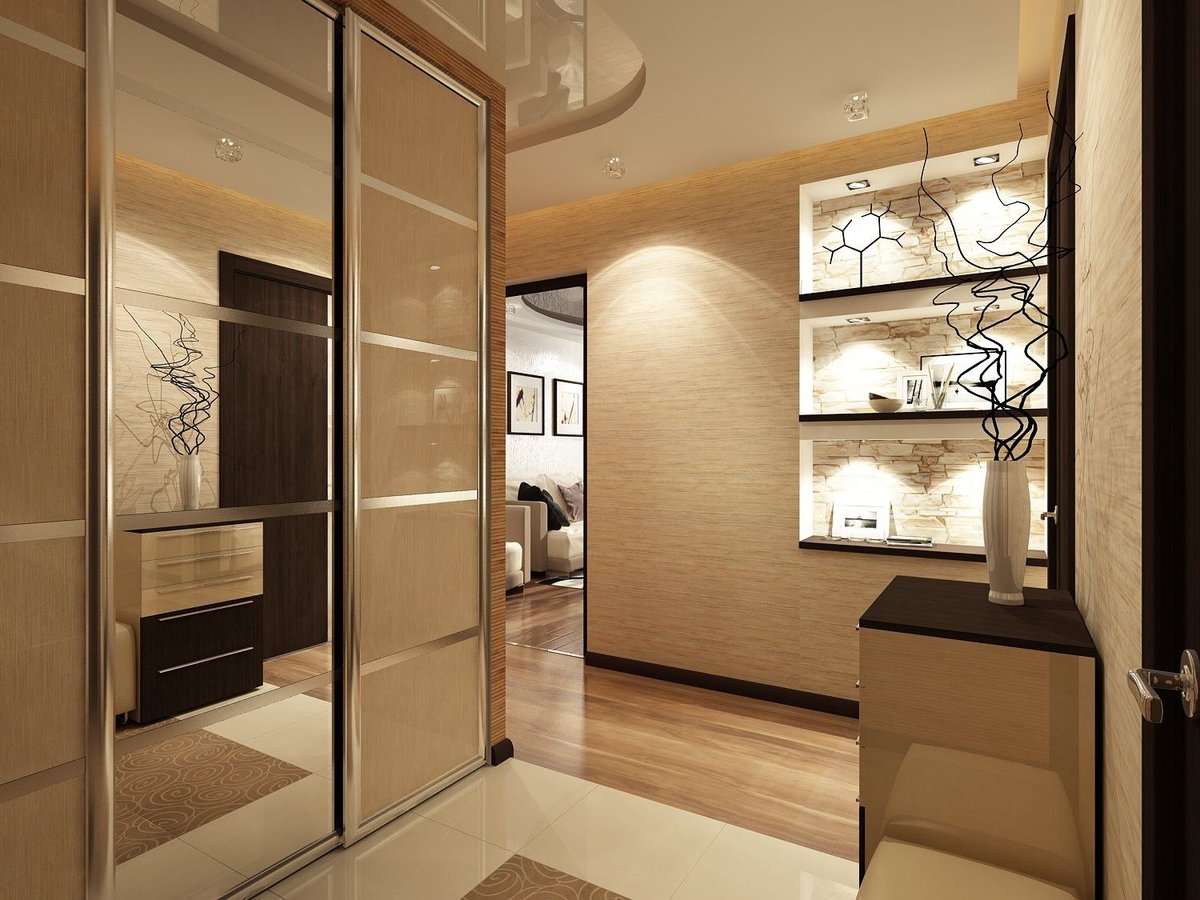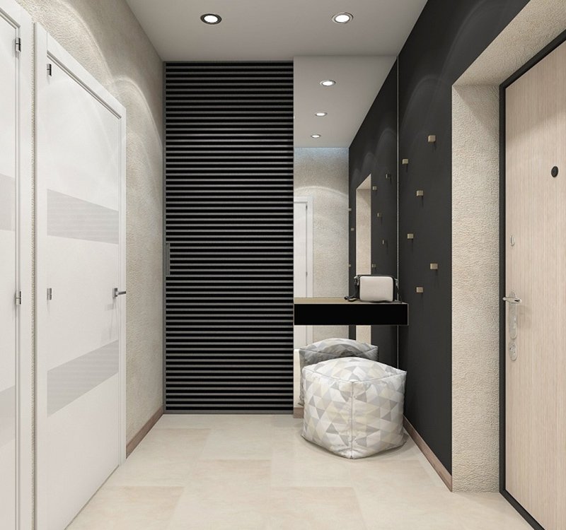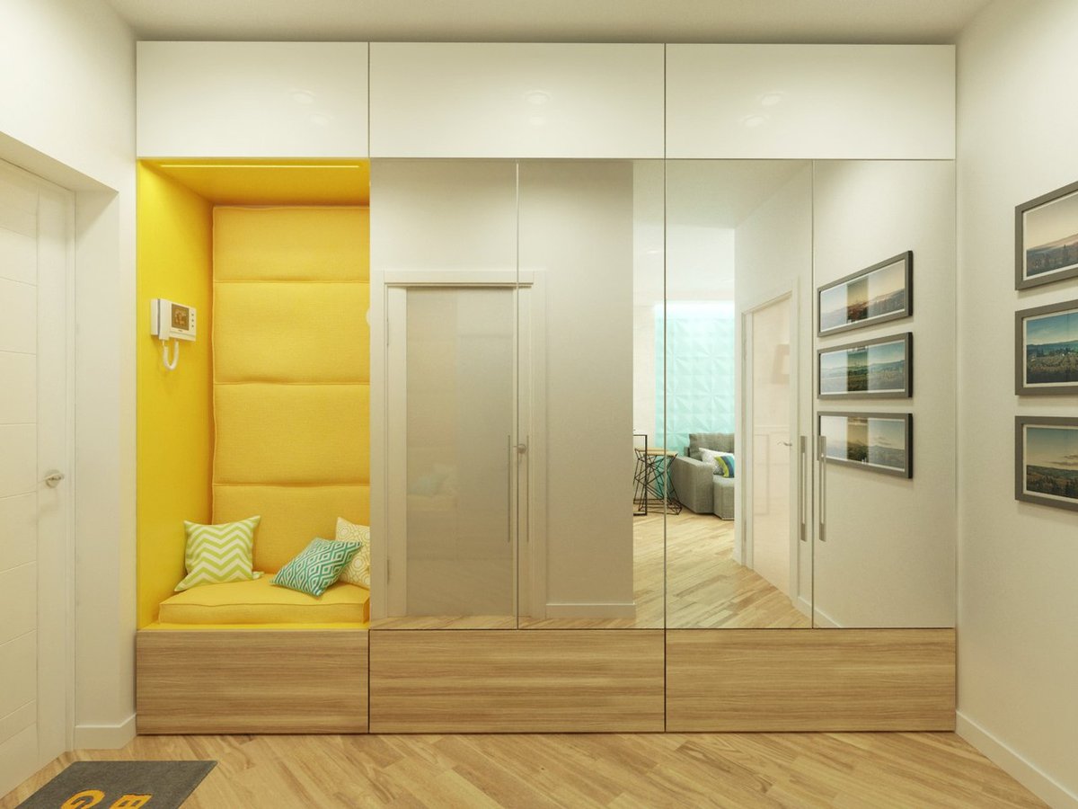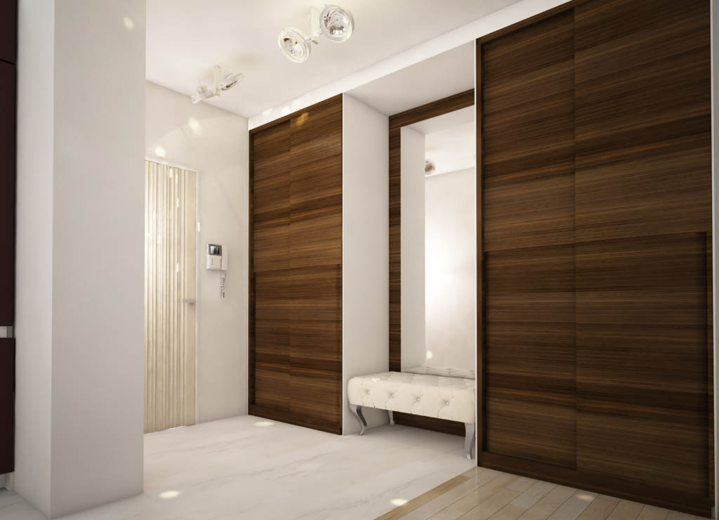 Se seleccionan casilleros cortos y estrechos para los pequeños frente. Las estructuras del casco son inaceptables aquí, ya que ocupan mucho espacio. Para la expansión visual del espacio, aquí se utilizan superficies brillantes brillantes y espejos de cuerpo entero. Los adornos brillantes, multicolores y excesivamente detallados no son adecuados: en una habitación estrecha se ven mal.